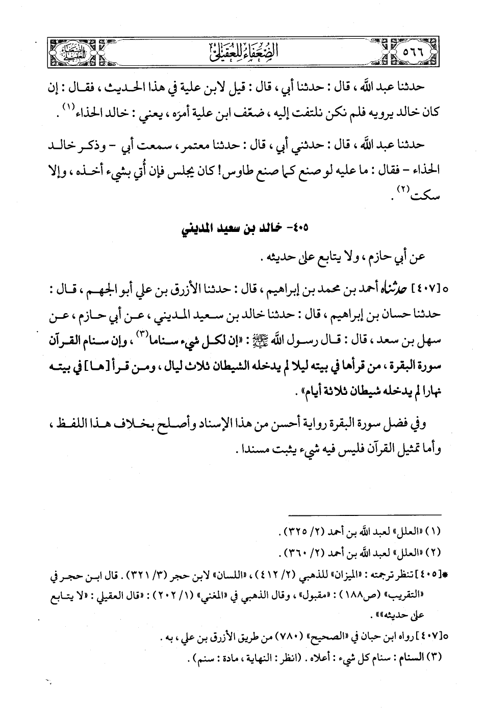 [407] (4) حدثناه أحمد بن محمد بن إبراهيم، قال: حدثنا الأزرق بن علي أبو الجهم، قال: حدثنا حسان بن إبراهيم، قال: حدثنا خالد بن سعيد المديني، عن أبي حازم، عن سهل بن سعد، قال: قال رسول الله صلى الله عليه وسلمع: «إن لكل شيء سناما (5)، وإن سنام القرآن سورة البقرة، من قرأها في بيته ليلا لم يدخله الشيطان ثلاث ليال، ومن قرأ [ها] في بيته نهارا لم يدخله شيطان ثلاثة أيام».