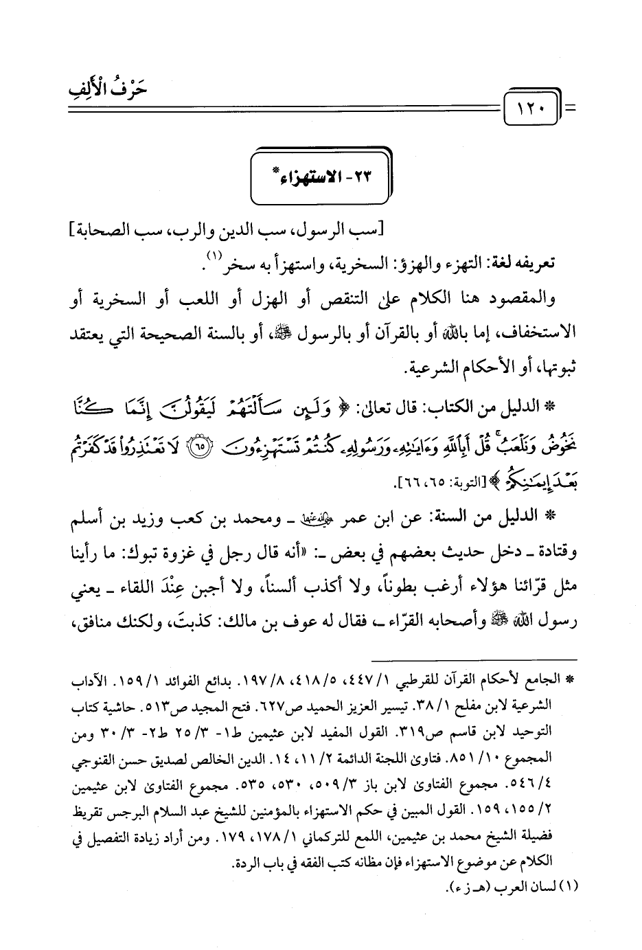 * الجامع لأحكام القرآن للقرطبي ١/ ٤٤٧، ٥/ ٤١٨، ٨/ ١٩٧. بدائع الفوائد ١/ ١٥٩. الآداب الشرعية لابن مفلح ١/ ٣٨. تيسير العزيز الحميد ص ٦٢٧. فتح المجيد ص ٥١٣. حاشية كتاب التوحيد لابن قاسم ص ٣١٩. القول المفيد لابن عثيمين ط ١ - ٣/ ٢٥ ط ٢ - ٣/ ٣٠ ومن المجموع ١٠/ ٨٥١. فتاوى اللجنة الدائمة ٢/ ١١، ١٤. الدين الخالص لصديق حسن القنوجي ٤/ ٥٤٦. مجموع الفتاوى لابن باز ٣/ ٥٠٩، ٥٣٠، ٥٣٥. مجموع الفتاوى لابن عثيمين ٢/ ١٥٥، ١٥٩. القول المبين في حكم الاستهزاء بالمؤمنين للشيخ عبد السلام البرجس تقريظ فضيلة الشيخ محمد بن عثيمين، اللمع للتركماني ١/ ١٧٨، ١٧٩. ومن أراد زيادة التفصيل في الكلام عن موضوع الاستهزاء فإن مظانه كتب الفقه في باب الردة.