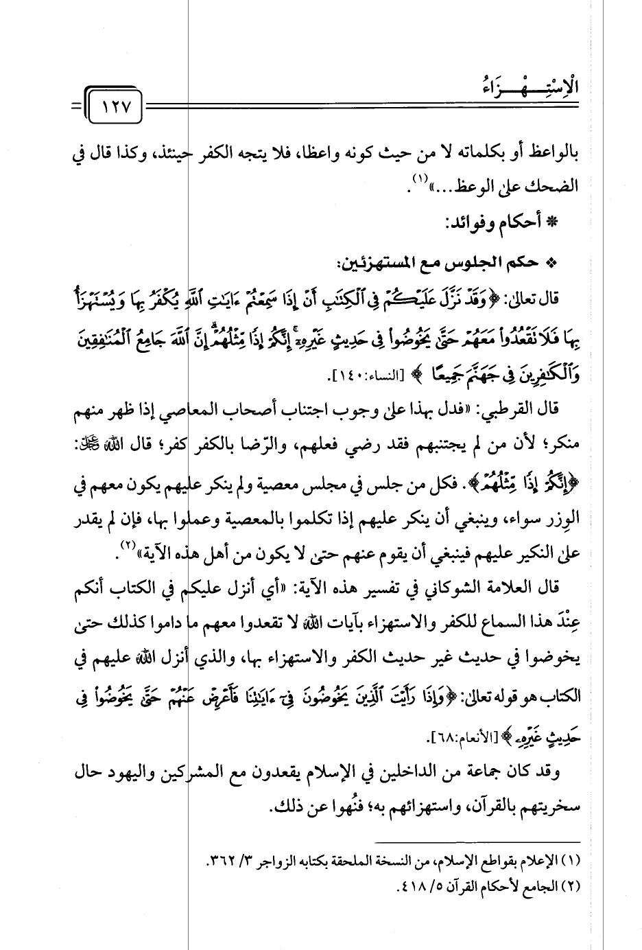 قال تعالى: {وَقَدْ نَزَّلَ عَلَيْكُمْ فِي الْكِتَابِ أَنْ إِذَا سَمِعْتُمْ آيَاتِ اللَّهِ يُكْفَرُ بِهَا وَيُسْتَهْزَأُ بِهَا فَلَا تَقْعُدُوا مَعَهُمْ حَتَّى يَخُوضُوا فِي حَدِيثٍ غَيْرِهِ إِنَّكُمْ إِذًا مِثْلُهُمْ إِنَّ اللَّهَ جَامِعُ الْمُنَافِقِينَ وَالْكَافِرِينَ فِي جَهَنَّمَ جَمِيعًا} [النساء: ١٤٠].