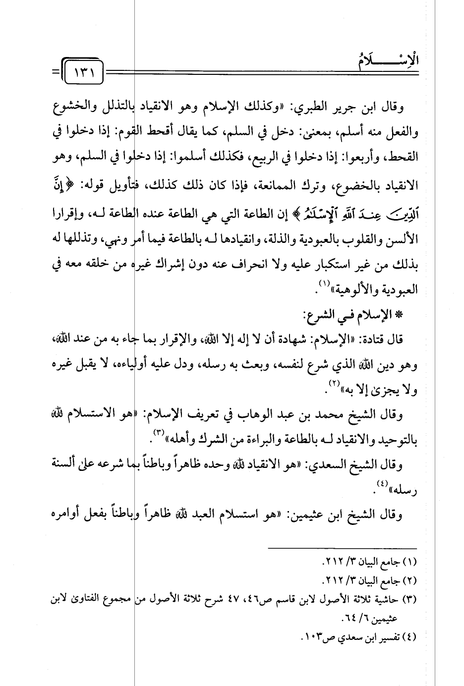 وقال الشيخ محمد بن عبد الوهاب في تعريف الإسلام: "هو الاستسلام لله بالتوحيد والانقياد له بالطاعة والبراءة من الشرك وأهله" (¬٣).