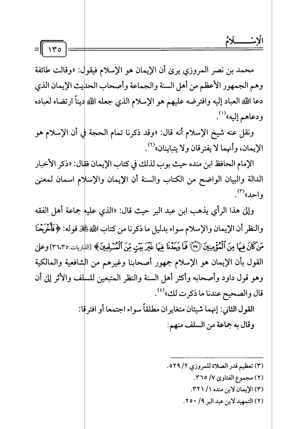 وإلى هذا الرأي يذهب ابن عبد البر حيث قال: "الذي عليه جماعة أهل الفقه والنظر أن الإيمان والإسلام سواء بدليل ما ذكرنا من كتاب الله عز وجل قوله: {فَأَخْرَجْنَا مَنْ كَانَ فِيهَا مِنَ الْمُؤْمِنِينَ (٣٥) فَمَا وَجَدْنَا فِيهَا غَيْرَ بَيْتٍ مِنَ الْمُسْلِمِينَ} [الذاريات: ٣٥، ٣٦] وعلى القول بأن الإيمان هو الإسلام جمهور أصحابنا وغيرهم من الشافعية والمالكية وهو قول داود وأصحابه وأكثر أهل السنة والنظر المتبعين للسلف والأثر إلى أن قال والصحيح عندنا ما ذكرت لك" (¬٤).