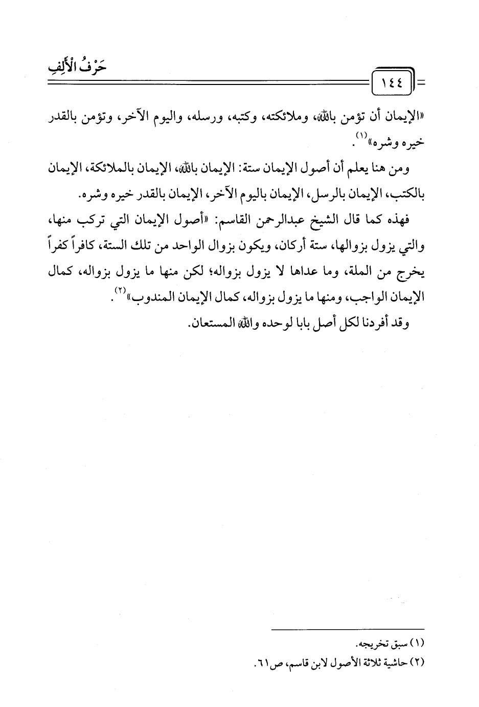 فهذه كما قال الشيخ عبد الرحمن القاسم: "أصول الإيمان التي تركب منها، والتي يزول بزوالها، ستة أركان، ويكون بزوال الواحد من تلك الستة، كافرًا كفرًا يخرج من الملة، وما عداها لا يزول بزواله؛ لكن منها ما يزول بزواله، كمال الإيمان الواجب، ومنها ما يزول بزواله، كمال الإيمان المندوب" (¬٢).
