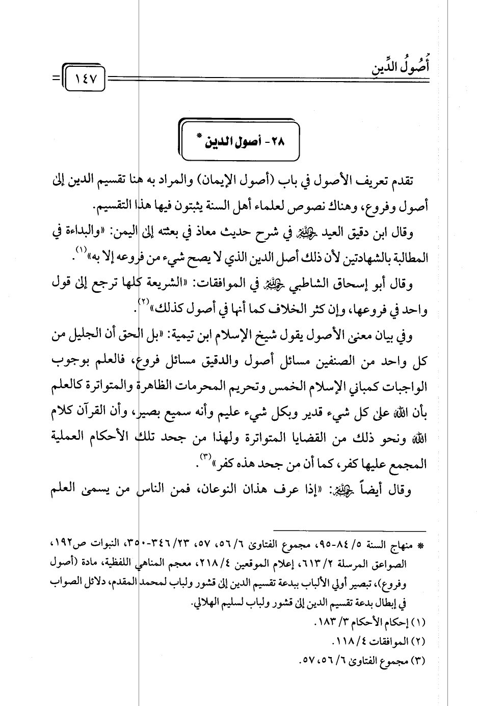 وفي بيان معنى الأصول يقول شيخ الإسلام ابن تيمية: "بل الحق أن الجليل من كل واحد من الصنفين مسائل أصول والدقيق مسائل فروع، فالعلم بوجوب الواجبات كمباني الإسلام الخمس وتحريم المحرمات الظاهر والمتواترة كالعلم بأن الله على كل شيء قدير وبكل شيء عليم وأنه سميع بصير، وأن القرآن كلام الله ونحو ذلك من القضايا المتواترة ولهذا من جحد تلك الأحكام العملية المجمع عليها كفر، كما أن من جحد هذه كفر" (¬٣).