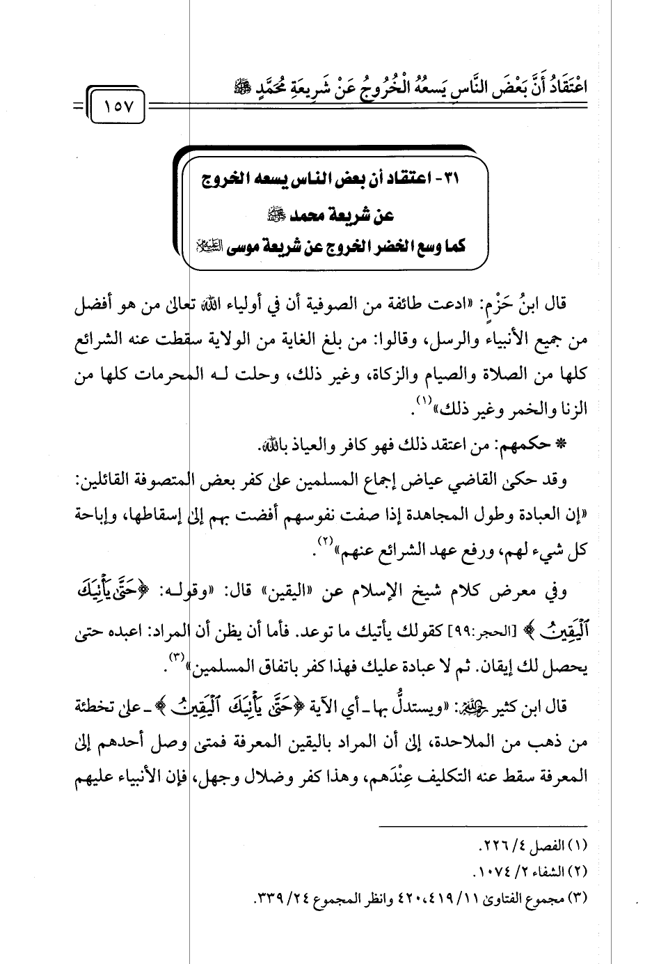 ٣١ - اعتقاد أن بعض الناس يسعه الخروج عن شريعة محمد - صلى الله عليه وسلم - كما وسع الخضر الخروج عن شريعة موسى عليه السلام