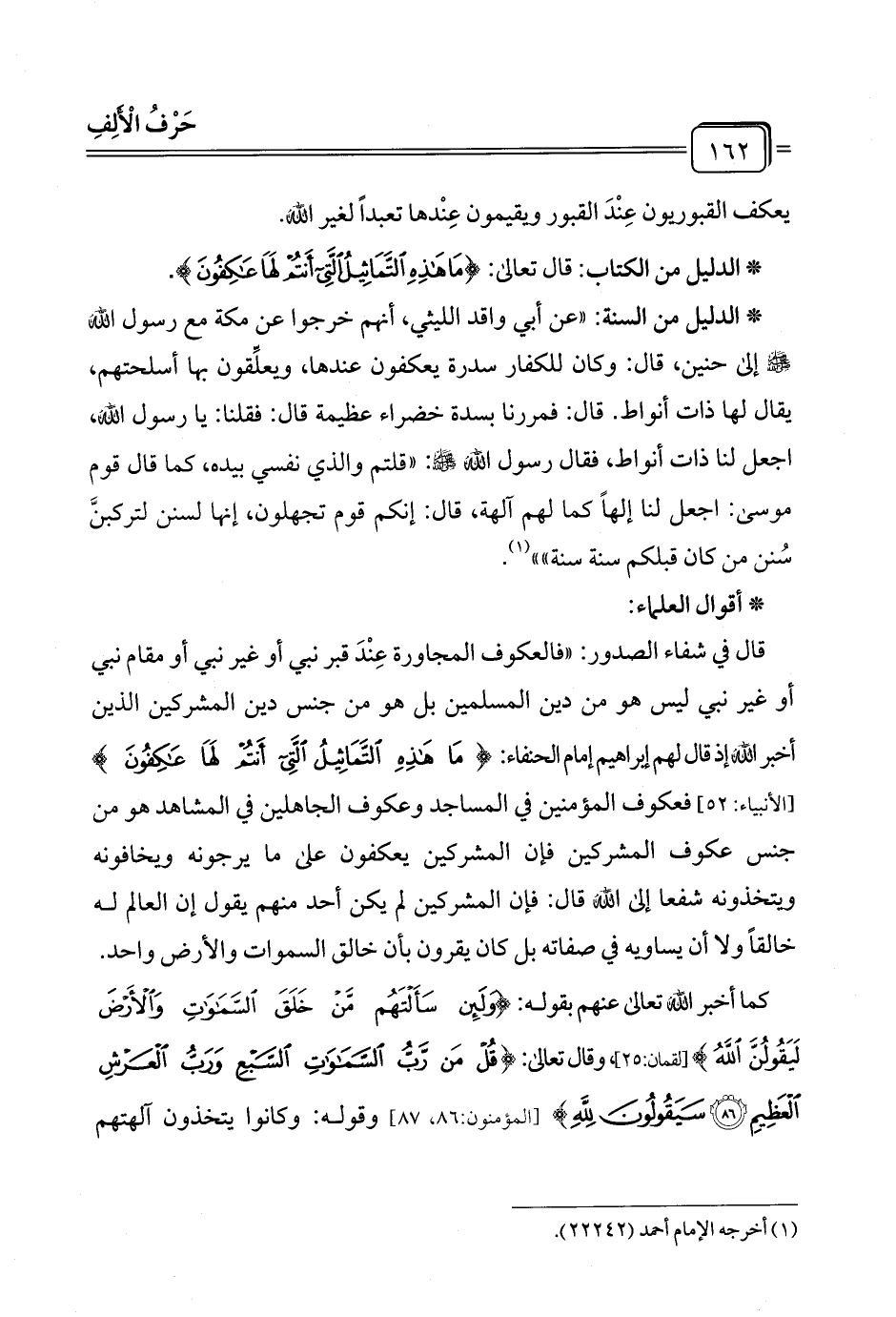 قال في شفاء الصدور: "فالعكوف المجاورة عِنْدَ قبر نبي أو غير نبي أو مقام نبي أو غير نبي ليس هو من دين المسلمين بل هو من جنس دين المشركين الذين أخبرالله إذ قال لهم إبراهيم إمام الحنفاء: {مَا هَذِهِ التَّمَاثِيلُ الَّتِي أَنْتُمْ لَهَا عَاكِفُونَ} [الأنبياء: ٥٢] فعكوف المؤمنين في المساجد وعكوف الجاهلين في المشاهد هو من جنس عكوف المشركين فإن المشركين يعكفون على ما يرجونه ويخافونه ويتخذونه شفعا إلى الله قال: فإن المشركين لم يكن أحد منهم يقول إن العالم له خالقًا ولا أن يساويه في صفاته بل كان يقرون بأن خالق السموات والأرض واحد.