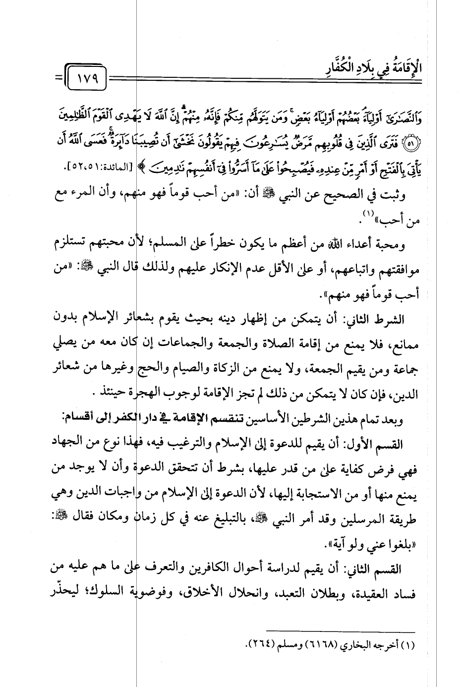 الشرط الثاني: أن يتمكن من إظهار دينه بحيث يقوم بشعائر الإسلام بدون ممانع، فلا يمنع من إقامة الصلاة والجمعة والجماعات إن كان معه من يصلي جماعة ومن يقيم الجمعة، ولا يمنع من الزكاة والصيام والحج وغيرها من شعائر الدين، فإن كان لا يتمكن من ذلك لم تجز الإقامة لوجوب الهجرة حينئذ.
