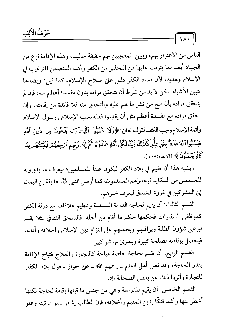 الناس من الاغترار بهم، ويبين للمعجبين بهم حقيقة حالهم، وهذه الإقامة نوع من الجهاد أيضا لما يترتب عليها من التحذير من الكفر وأهله المتضمن للترغيب في الإسلام وهديه، لأن فساد الكفر دليل على صلاح الإسلام، كما قيل: وبضدها تتبين الأشياء. لكن لا بد من شرط أن يتحقق مراده بدون مفسدة أعظم منه، فإن لم يتحقق مراده بأن منع من نشر ما هم عليه والتحذير منه فلا فائدة من إقامته، وإن تحقق مراده مع مفسدة أعظم مثل أن يقابلوا فعله بسب الإسلام ورسول الإسلام وأئمة الإسلام وجب الكف لقوله تعالى: {وَلَا تَسُبُّوا الَّذِينَ يَدْعُونَ مِنْ دُونِ اللَّهِ فَيَسُبُّوا اللَّهَ عَدْوًا بِغَيْرِ عِلْمٍ كَذَلِكَ زَيَّنَّا لِكُلِّ أُمَّةٍ عَمَلَهُمْ ثُمَّ إِلَى رَبِّهِمْ مَرْجِعُهُمْ فَيُنَبِّئُهُمْ بِمَا كَانُوا يَعْمَلُونَ} [الأنعام: ١٠٨].