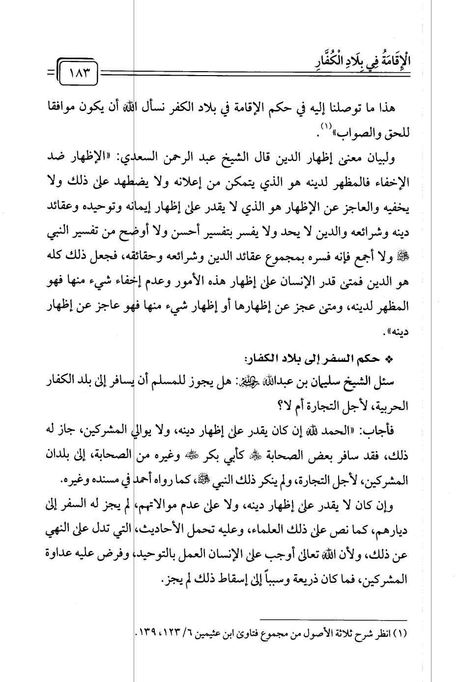 وإن كان لا يقدر على إظهار دينه، ولا على عدم موالاتهم، لم يجز له السفر إلى ديارهم، كما نص على ذلك العلماء، وعليه تحمل الأحاديث، التي تدل على النهي عن ذلك، ولأن الله تعالى أوجب على الإنسان العمل بالتوحيد، وفرض عليه عداوة المشركين، فما كان ذريعة وسببًا إلى إسقاط ذلك لم يجز.