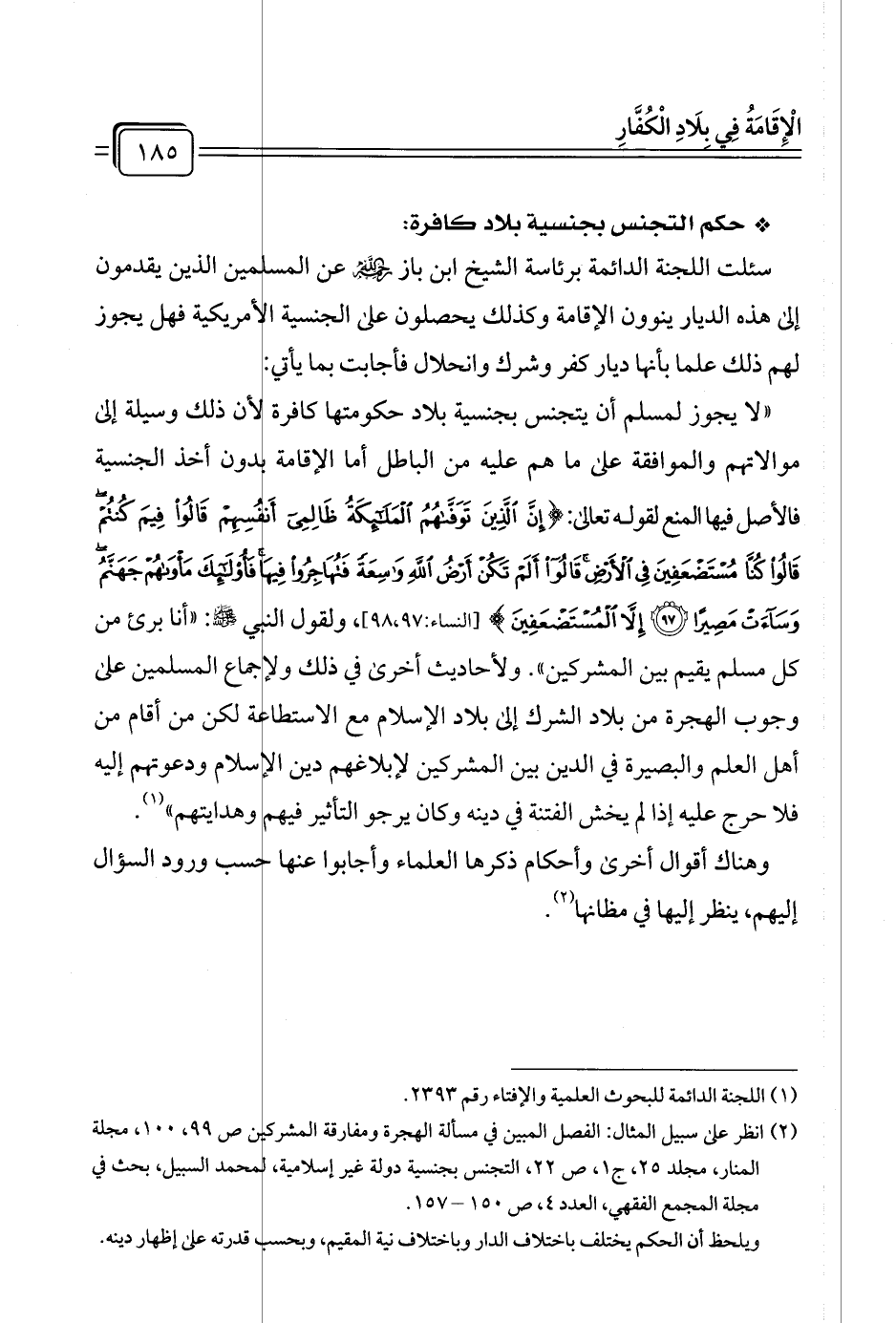 (¬٢) انظر على سبيل المثال: الفصل المبين في مسألة الهجرة ومفارقة المشركين ص ٩٩، ١٠٠، مجلة المنار، مجلد ٢٥، ج ١، ص ٢٢، التجنس بجنسية دولة غير إسلامية، لمحمد السبيل، بحث في مجلة المجمع الفقهي، العدد ٤، ص ١٥٠ - ١٥٧.