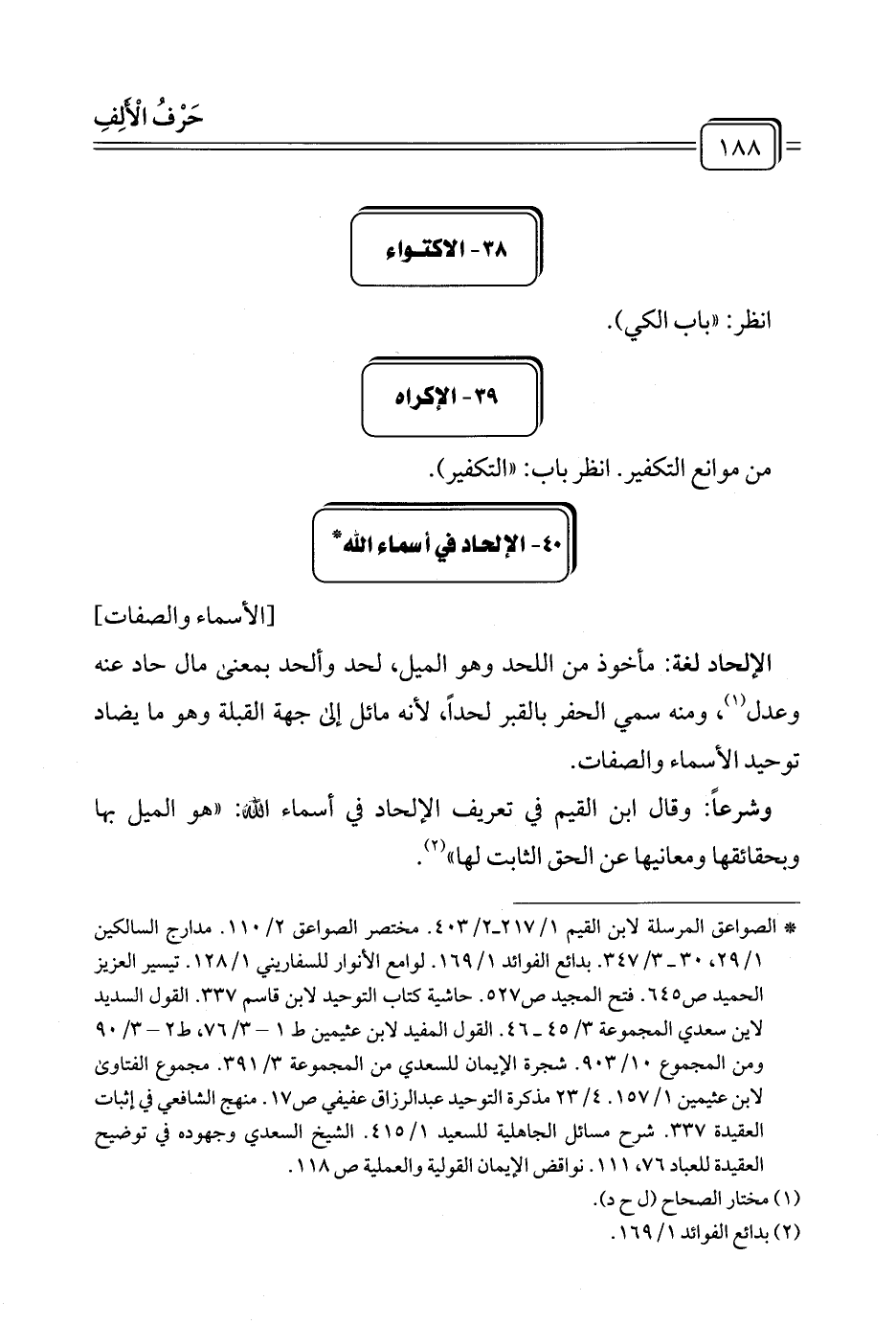 الإلحاد لغة: مأخوذ من اللحد وهو الميل، لحد وألحد بمعنى مال حاد عنه وعدل (¬١)، ومنه سمي الحفر بالقبر لحدًا، لأنه مائل إلى جهة القبلة وهو ما يضاد توحيد الأسماء والصفات.