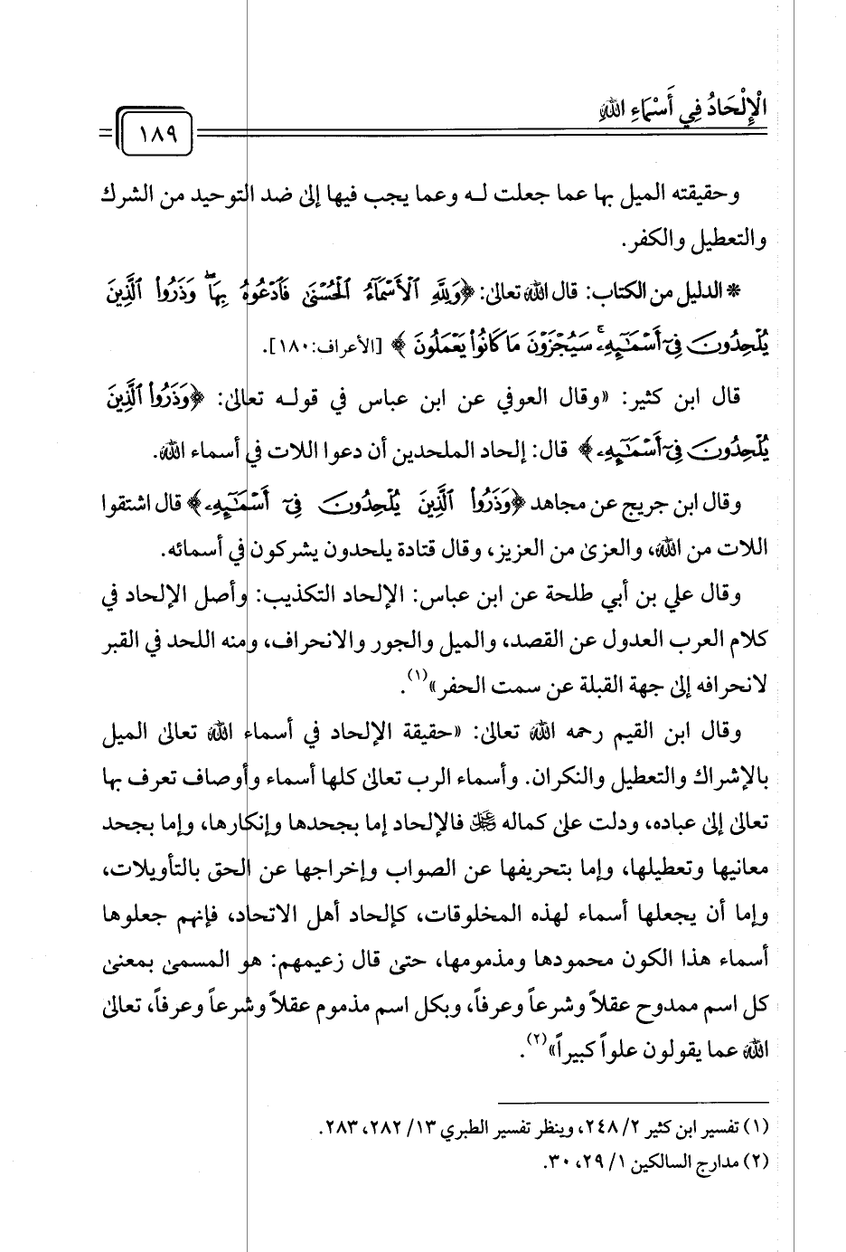 وقال ابن القيم رحمه الله تعالى: "حقيقة الإلحاد في أسماء الله تعالى الميل بالإشراك والتعطيل والنكران. وأسماء الرب تعالى كلها أسماء وأوصاف تعرف بها تعالى إلى عباده، ودلت على كماله عز وجل فالإلحاد إما بجحدها وإنكارها، وإما بجحد معانيها وتعطيلها، وإما بتحريفها عن الصواب وإخراجها عن الحق بالتأويلات، وإما أن يجعلها أسماء لهذه المخلوقات، كإلحاد أهل الاتحاد، فإنهم جعلوها أسماء هذا الكون محمودها ومذمومها، حتى قال زعيمهم: هو المسمى بمعنى كل اسم ممدوح عقلًا وشرعًا وعرفًا، وبكل اسم مذموم عقلًا وشرعًا وعرفًا، تعالى الله عما يقولون علوًا كبيرًا" (¬٢).