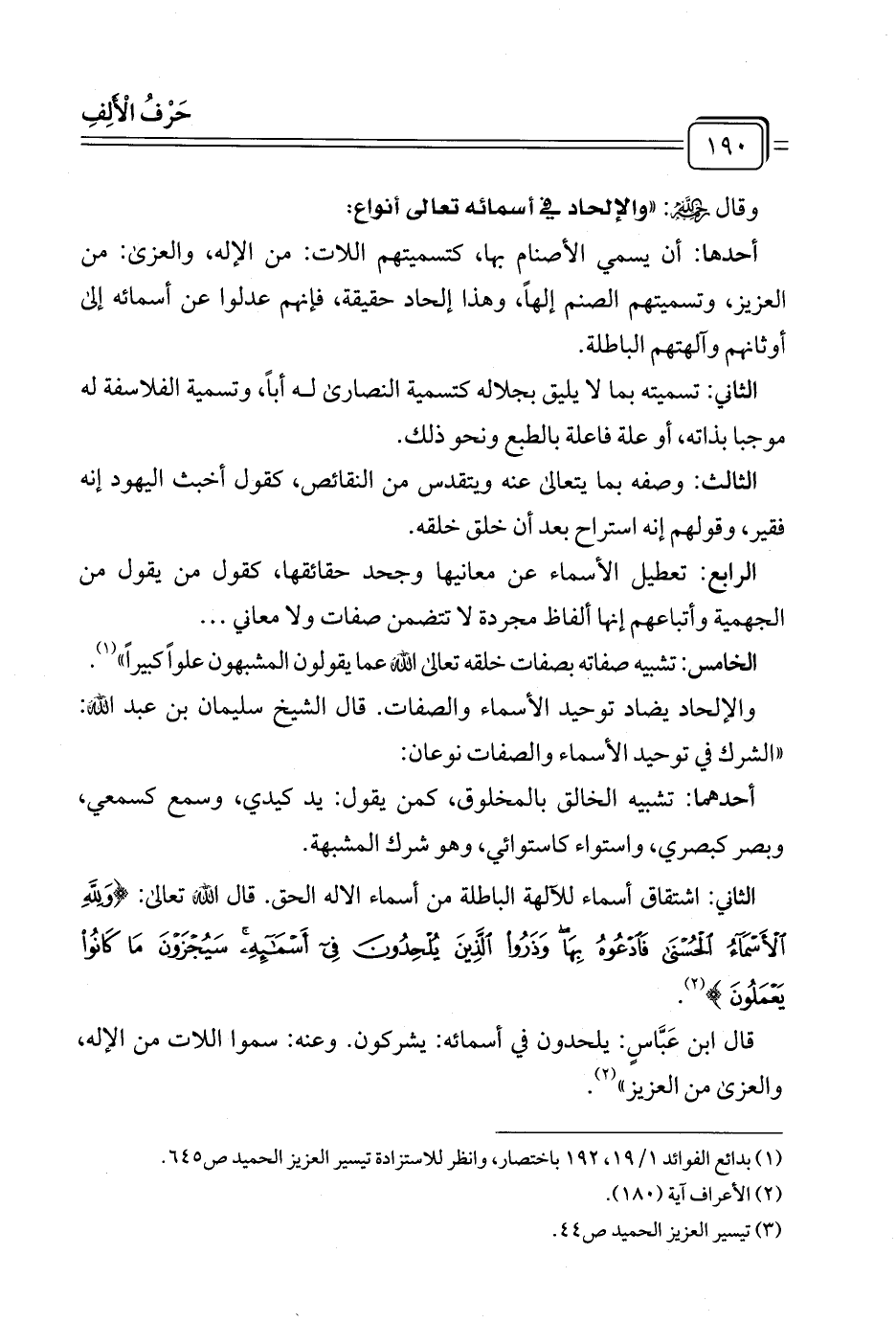 وقال رحمه الله: "والإلحاد في أسمائه تعالى أنواع: