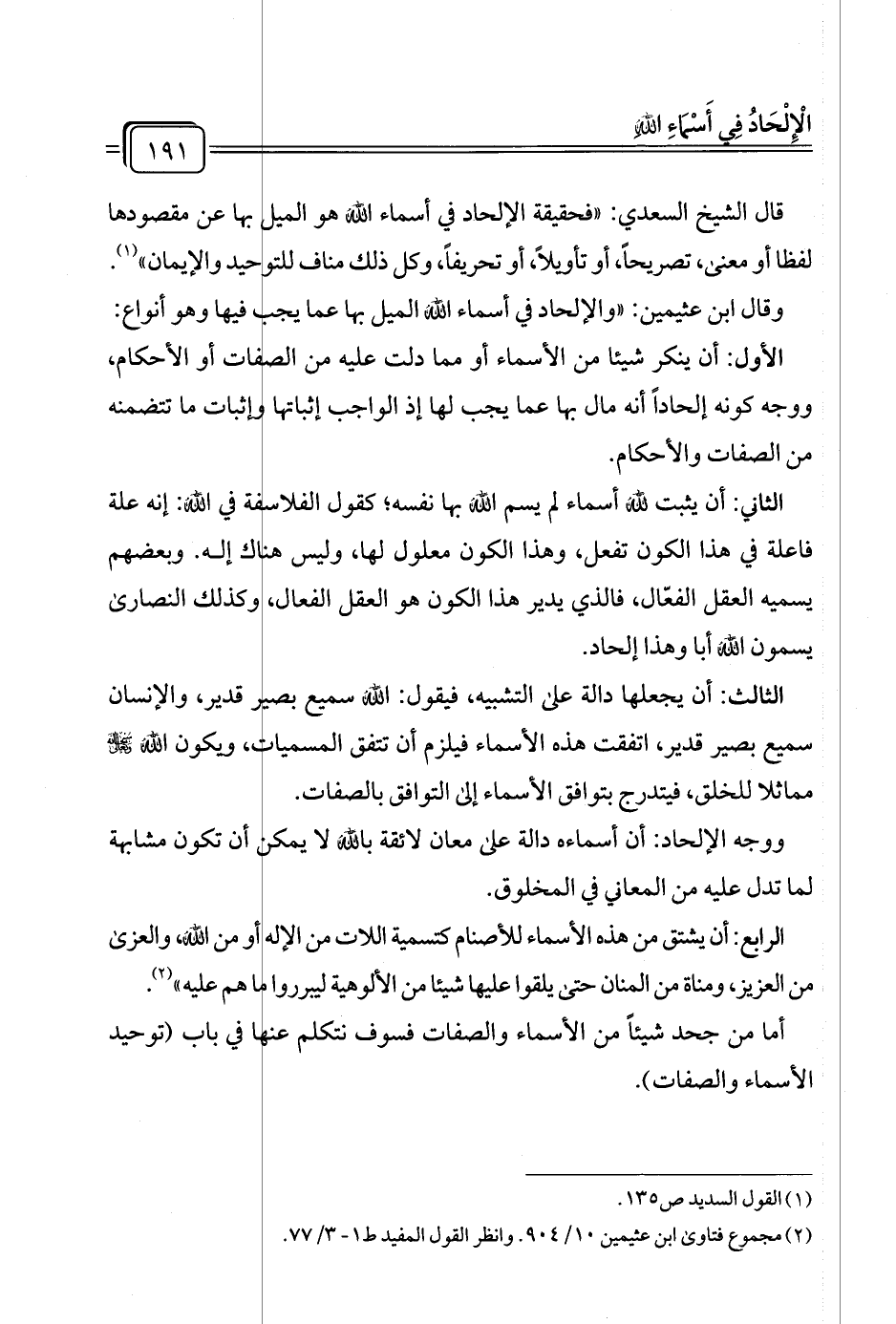 قال الشيخ السعدي: "فحقيقة الإلحاد في أسماء الله هو الميل بها عن مقصودها لفظا أو معنى، تصريحًا، أو تأويلًا، أو تحريفًا، وكل ذلك مناف للتوحيد والإيمان" (¬١).