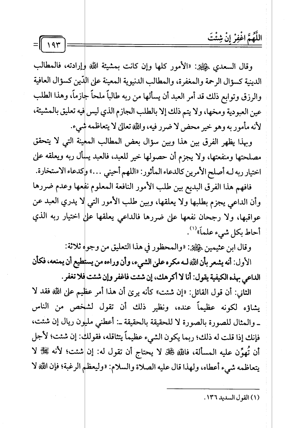 وقال السعدي رحمه الله: "الأمور كلها وإن كانت بمشيئة الله وإرادته، فالمطالب الدينية كسؤال الرحمة والمغفرة، والمطالب الدنيوية المعينة على الدّين كسؤال العافية والرزق وتوابع ذلك قد أمر العبد أن يسألها من ربه طالبًا ملحًا جازمًا، وهذا الطلب عين العبودية ومخها، ولا يتم ذلك إلا بالطلب الجازم الذي ليس فيه تعليق بالمشيئة، لأنه مأمور به وهو خير محض لا ضرر فيه، والله تعالى لا يتعاظمه شيء.