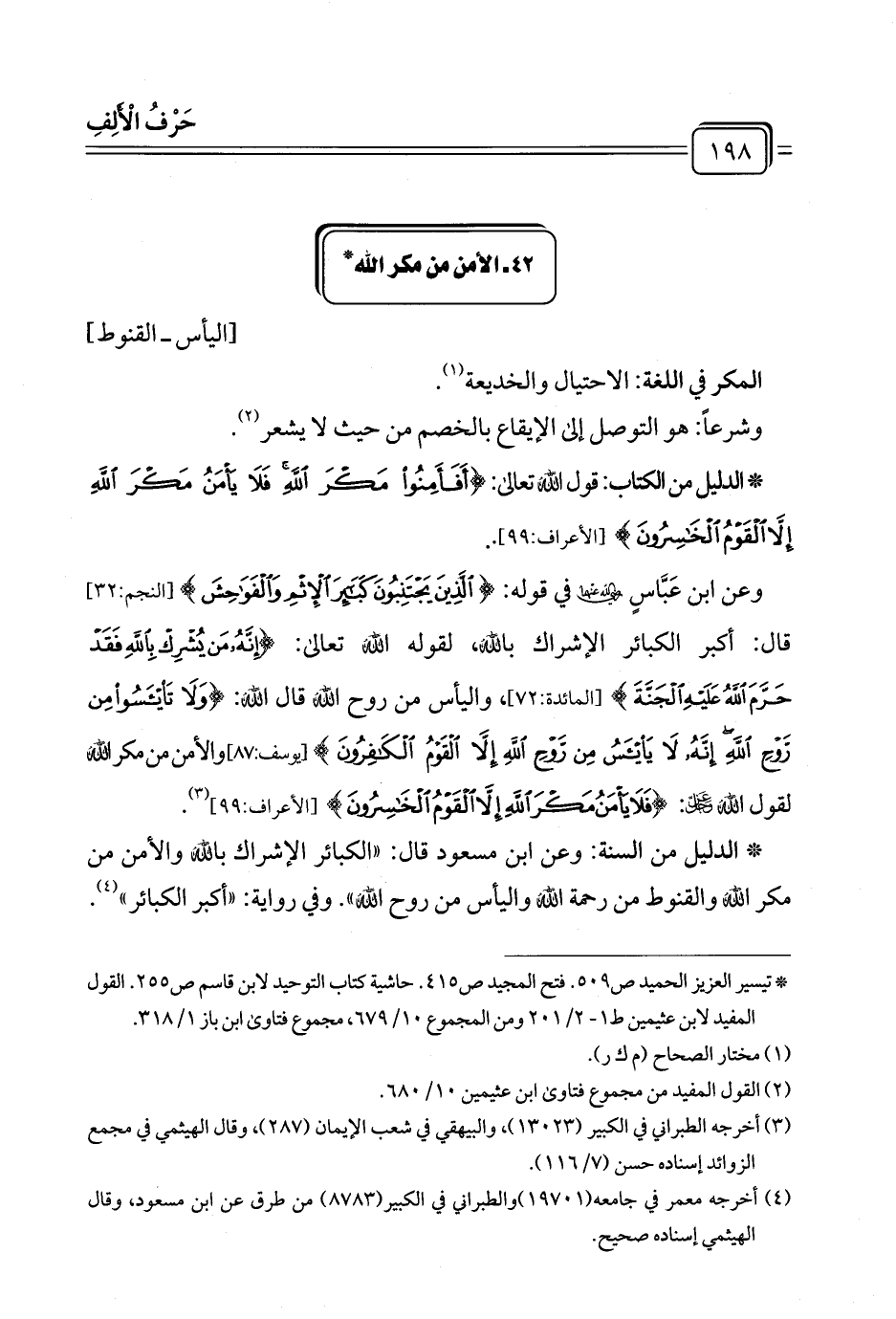 * الدليل من الكتاب: قول الله تعالى: {أَفَأَمِنُوا مَكْرَ اللَّهِ فَلَا يَأْمَنُ مَكْرَ اللَّهِ إِلَّا الْقَوْمُ الْخَاسِرُونَ} [الأعراف: ٩٩].