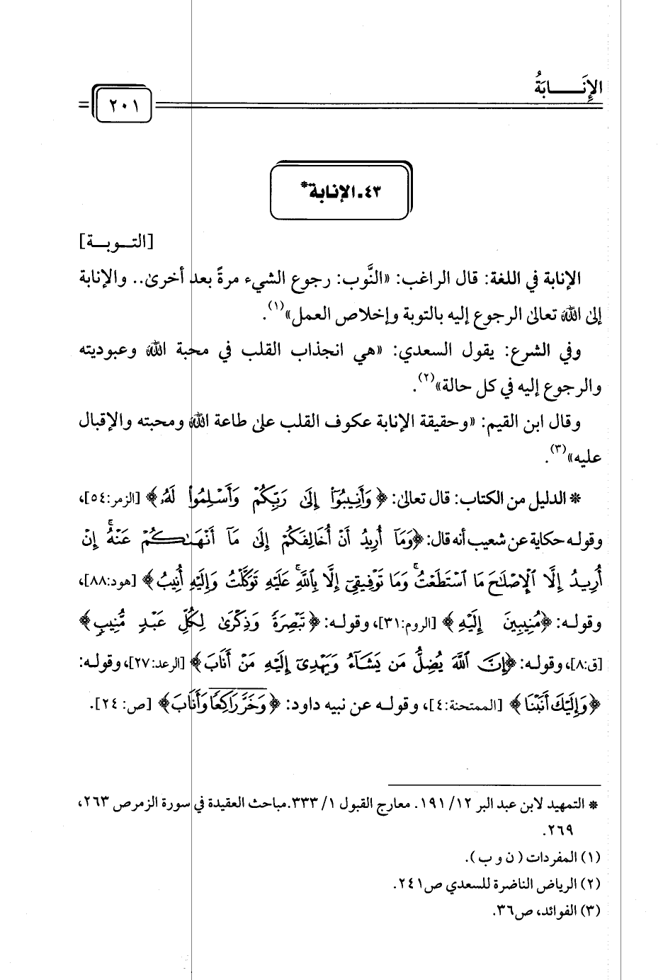 * الدليل من الكتاب: قال تعالى: {وَأَنِيبُوا إِلَى رَبِّكُمْ وَأَسْلِمُوا لَهُ} [الزمر: ٥٤]، وقوله حكاية عن شعيب أنه قال: {وَمَا أُرِيدُ أَنْ أُخَالِفَكُمْ إِلَى مَا أَنْهَاكُمْ عَنْهُ إِنْ أُرِيدُ إِلَّا الْإِصْلَاحَ مَا اسْتَطَعْتُ وَمَا تَوْفِيقِي إِلَّا بِاللَّهِ عَلَيْهِ تَوَكَّلْتُ وَإِلَيْهِ أُنِيبُ} [هود: ٨٨]، وقوله: {مُنِيبِينَ إِلَيْهِ} [الروم: ٣١]، وقوله: {تَبْصِرَةً وَذِكْرَى لِكُلِّ عَبْدٍ مُنِيبٍ} [ق: ٨]، وقوله: {إِنَّ اللَّهَ يُضِلُّ مَنْ يَشَاءُ وَيَهْدِي إِلَيْهِ مَنْ أَنَابَ} [الرعد: ٢٧]، وقوله: {وَإِلَيْكَ أَنَبْنَا} [الممتحنة: ٤]، وقوله عن نبيه داود: {وَخَرَّ رَاكِعًا وَأَنَابَ} [ص: ٢٤].