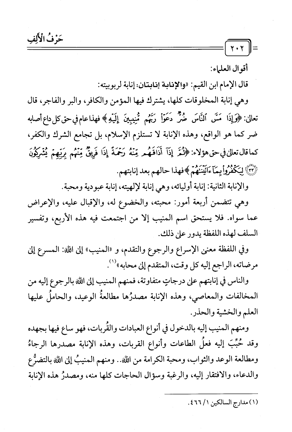 وهي تتضمن أربعة أمور: محبته، والخضوع له، والإقبال عليه، والإعراض عما سواه. فلا يستحق اسم المنيب إلا من اجتمعت فيه هذه الأربع، وتفسير السلف لهذه اللفظة يدور على ذلك.