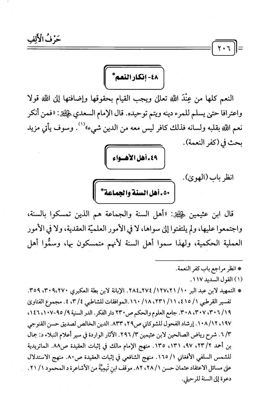 قال ابن عثيمين رحمهُ اللهُ: "أهل السنة والجماعة هم الذين تمسكوا بالسنة، واجتمعوا عليها، ولم يلتفتوا إلى سواها، لا في الأمور العلميّة العقدية، ولا في الأمور العملية الحكمية، ولهذا سموا أهل السنة لأنهم متمسكون بها، وسمُّوا أهل