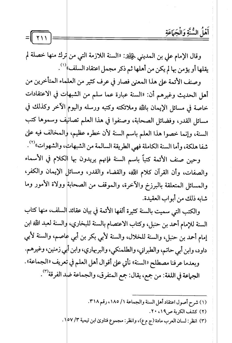 وقال الإمام علي بن المديني رحمهُ اللهُ: "السنة اللازمة التي من ترك منها خصلة لم يقلها أو يؤمن بها لم يكن من أهلها ثم ذكر مجمل اعتقاد السلف" (¬١).