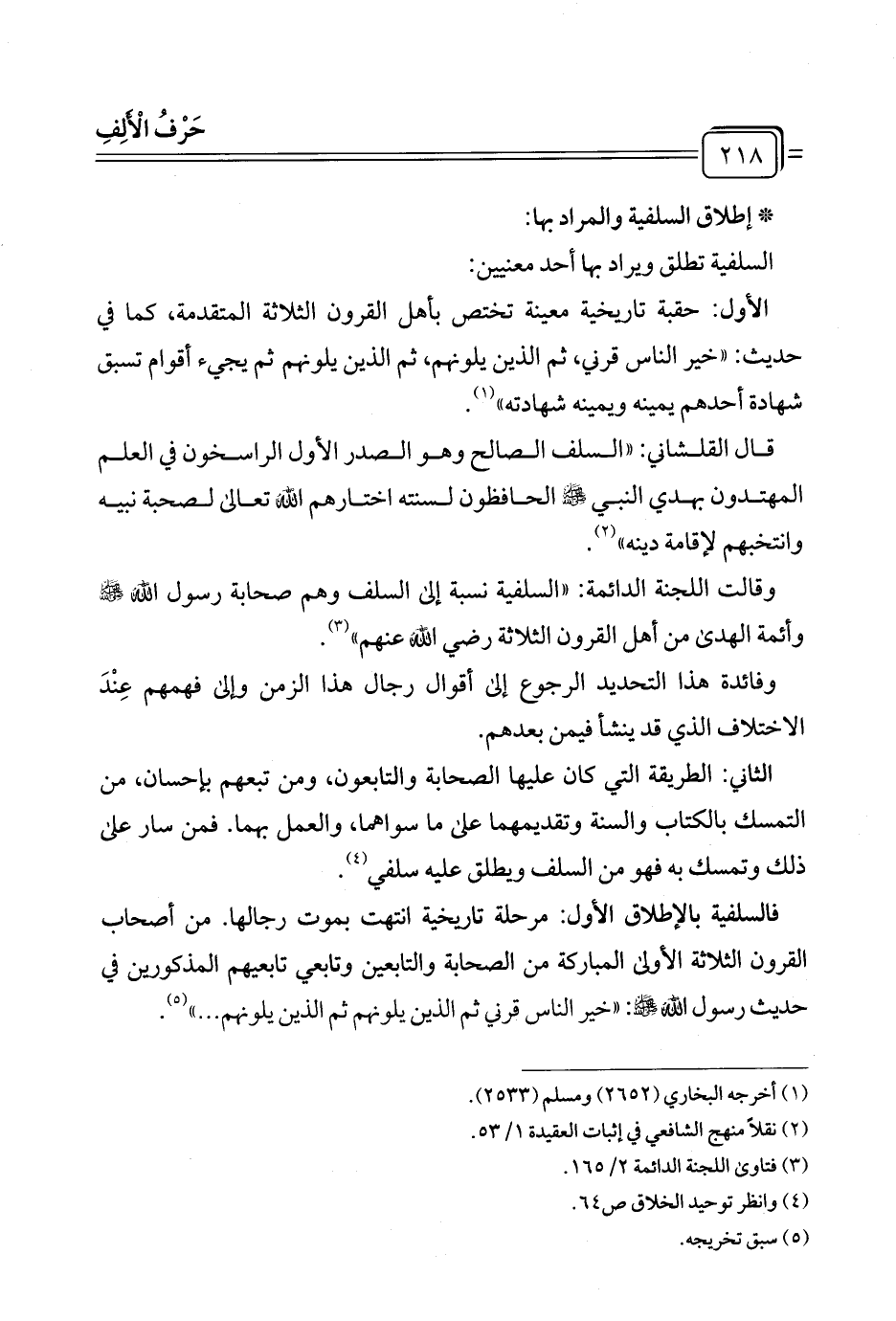 فالسلفية بالإطلاق الأول: مرحلة تاريخية انتهت بموت رجالها. من أصحاب القرون الثلاثة الأولى المباركة من الصحابة والتابعين وتابعي تابعيهم المذكورين في حديث رسول الله - صلى الله عليه وسلم -: "خير الناس قرني ثم الذين يلونهم ثم الذين يلونهم ... " (¬٥).