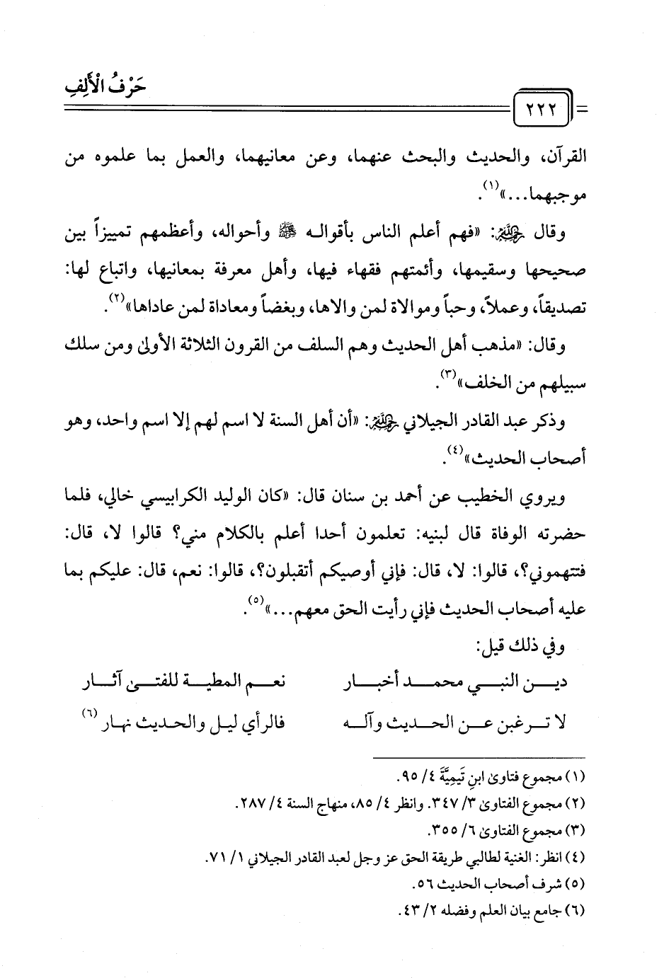 وقال رحمهُ اللهُ: "فهم أعلم الناس بأقواله - صلى الله عليه وسلم - وأحواله، وأعظمهم تمييزًا بين صحيحها وسقيمها، وأئمتهم فقهاء فيها، وأهل معرفة بمعانيها، واتباع لها: تصديقًا، وعملًا، وحبًا وموالاة لمن والاها، وبغضًا ومعاداة لمن عاداها" (¬٢).