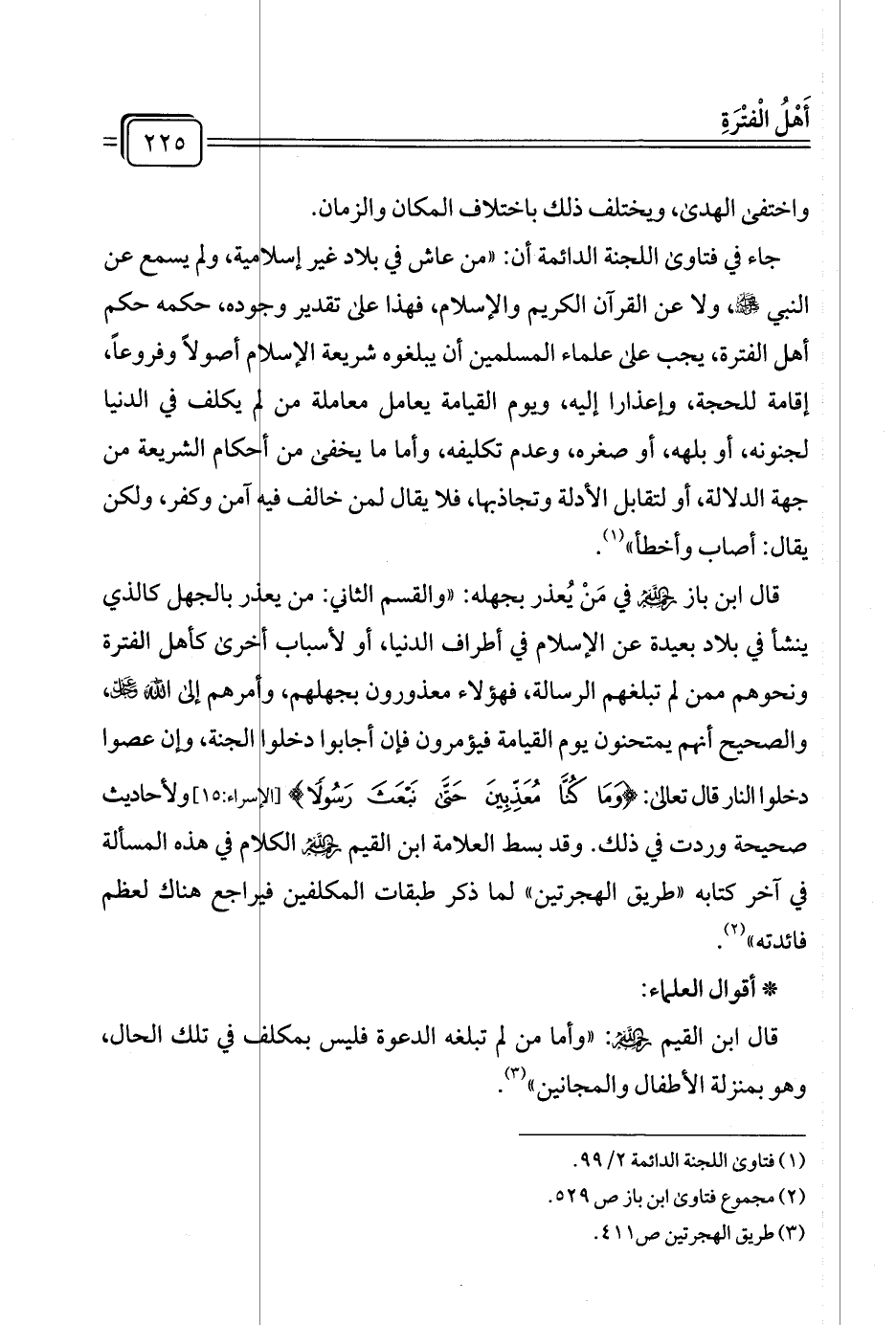 قال ابن باز رحمهُ اللهُ في مَنْ يُعذر بجهله: "والقسم الثاني: من يعذر بالجهل كالذي ينشأ في بلاد بعيدة عن الإسلام في أطراف الدنيا، أو لأسباب أخرى كأهل الفترة ونحوهم ممن لم تبلغهم الرسالة، فهؤلاء معذورون بجهلهم، وأمرهم إلى الله عزَّ وجلَّ، والصحيح أنهم يمتحنون يوم القيامة فيؤمرون فإن أجابوا دخلوا الجنة، وإن عصوا دخلوا النار قال تعالى: {وَمَا كُنَّا مُعَذِّبِينَ حَتَّى نَبْعَثَ رَسُولًا} [الإسراء: ١٥] ولأحاديث صحيحة وردت في ذلك. وقد بسط العلامة ابن القيم رحمهُ اللهُ الكلام في هذه المسألة في آخر كتابه "طريق الهجرتين" لما ذكر طبقات المكلفين فيراجع هناك لعظم فائدته" (¬٢).
