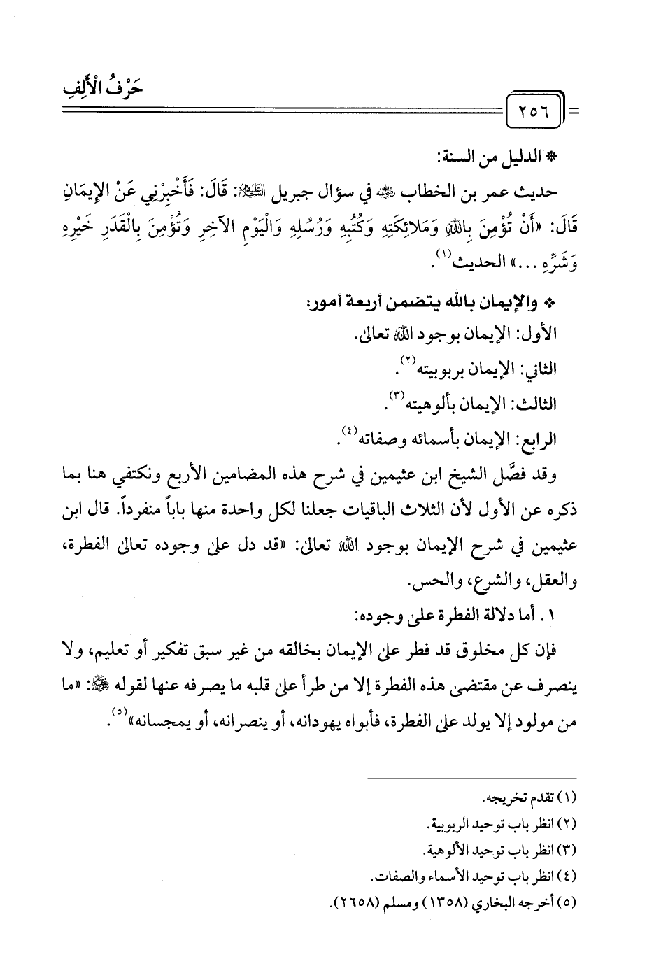 وقد فصَّل الشيخ ابن عثيمين في شرح هذه المضامين الأربع ونكتفي هنا بما ذكره عن الأول لأن الثلاث الباقيات جعلنا لكل واحدة منها بابًا منفردًا. قال ابن عثيمين في شرح الإيمان بوجود الله تعالى: "قد دل على وجوده تعالى الفطرة، والعقل، والشرع، والحس.