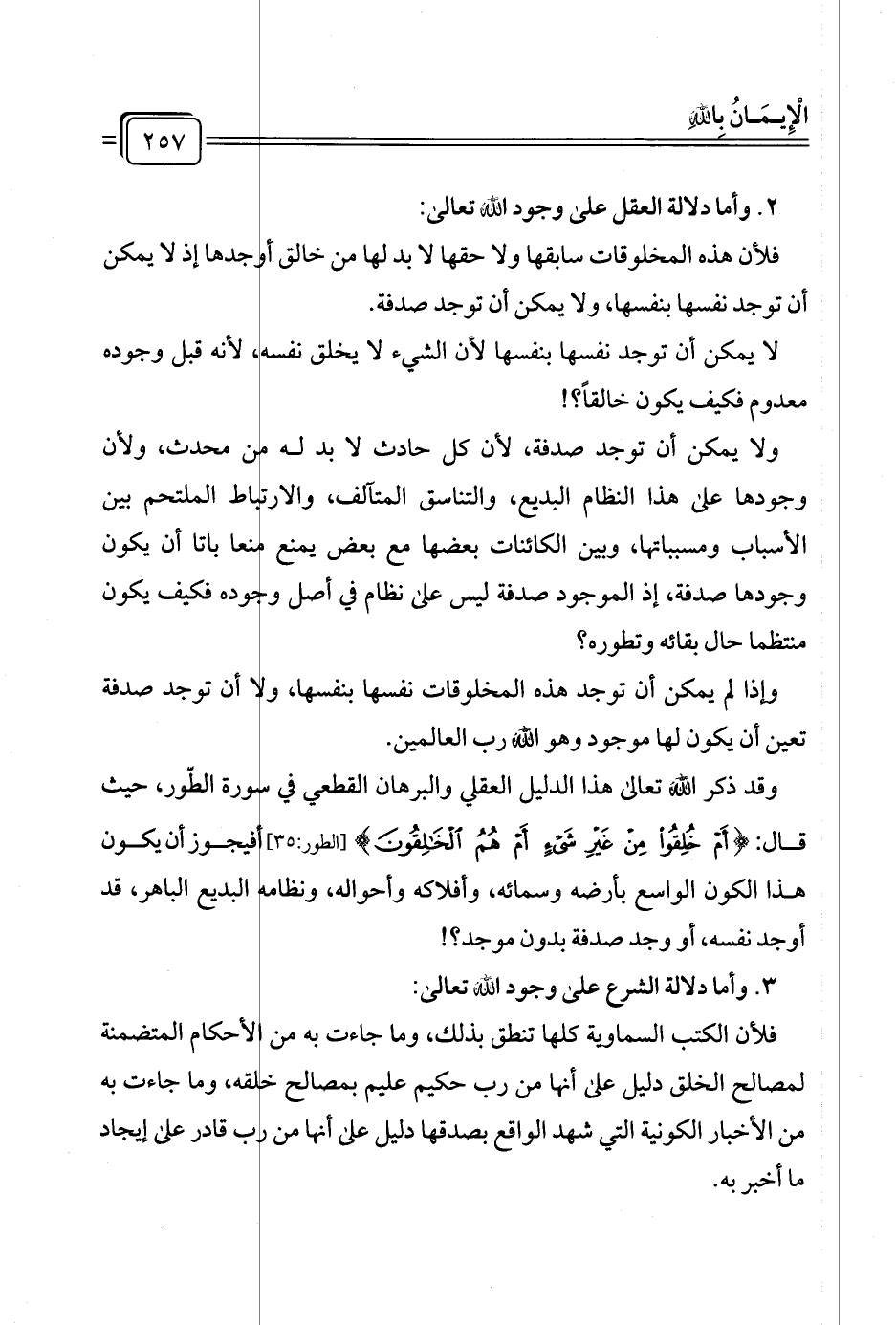 وقد ذكر الله تعالى هذا الدليل العقلي والبرهان القطعي في سورة الطّور، حيث قال: {أَمْ خُلِقُوا مِنْ غَيْرِ شَيْءٍ أَمْ هُمُ الْخَالِقُونَ} [الطور: ٣٥] أفيجوز أن يكون هذا الكون الواسع بأرضه وسمائه، وأفلاكه وأحواله، ونظامه البديع الباهر، قد أوجد نفسه، أو وجد صدفة بدون موجد؟!