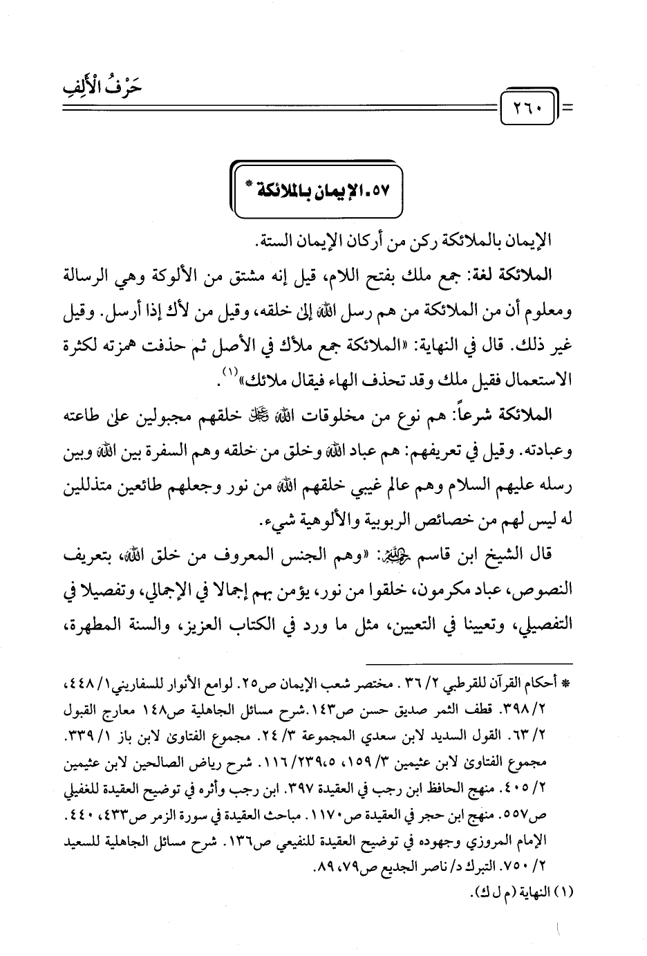 قال الشيخ ابن قاسم - رحمه الله -: "وهم الجنس المعروف من خلق الله، بتعريف النصوص، عباد مكرمون، خلقوا من نور، يؤمن بهم إجمالا في الإجمالي، وتفصيلا في التفصيلي، وتعيينا في التعيين، مثل ما ورد في الكتاب العزيز، والسنة المطهرة،
