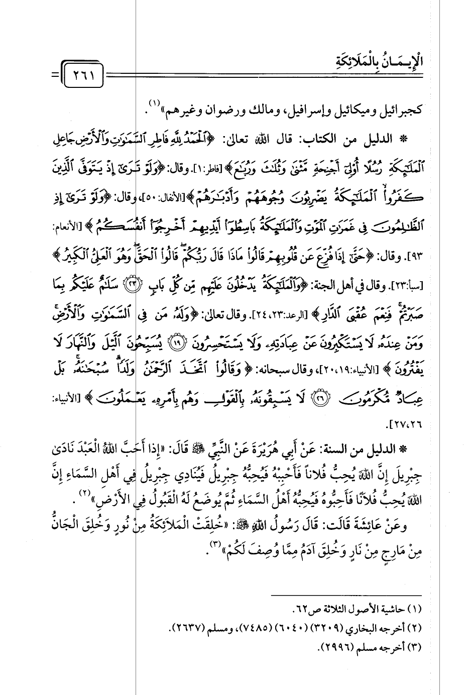 * الدليل من الكتاب: قال الله تعالى: {الْحَمْدُ لِلَّهِ فَاطِرِ السَّمَاوَاتِ وَالْأَرْضِ جَاعِلِ الْمَلَائِكَةِ رُسُلًا أُولِي أَجْنِحَةٍ مَثْنَى وَثُلَاثَ وَرُبَاعَ} [فاطر: ١]. وقال: {وَلَوْ تَرَى إِذْ يَتَوَفَّى الَّذِينَ كَفَرُوا الْمَلَائِكَةُ يَضْرِبُونَ وُجُوهَهُمْ وَأَدْبَارَهُمْ} [الأنفال: ٥٠]، وقال: {وَلَوْ تَرَى إِذِ الظَّالِمُونَ فِي غَمَرَاتِ الْمَوْتِ وَالْمَلَائِكَةُ بَاسِطُو أَيْدِيهِمْ أَخْرِجُوا أَنْفُسَكُمُ} [الأنعام: ٩٣]. وقال: {حَتَّى إِذَا فُزِّعَ عَنْ قُلُوبِهِمْ قَالُوا مَاذَا قَالَ رَبُّكُمْ قَالُوا الْحَقَّ وَهُوَ الْعَلِيُّ الْكَبِيرُ} [سبأ: ٢٣]. وقال في أهل الجنة: {وَالْمَلَائِكَةُ يَدْخُلُونَ عَلَيْهِمْ مِنْ كُلِّ بَابٍ (٢٣) سَلَامٌ عَلَيْكُمْ بِمَا صَبَرْتُمْ فَنِعْمَ عُقْبَى الدَّارِ} [الرعد: ٢٣، ٢٤]. وقال تعالى: {وَلَهُ مَنْ فِي السَّمَاوَاتِ وَالْأَرْضِ وَمَنْ عِنْدَهُ لَا يَسْتَكْبِرُونَ عَنْ عِبَادَتِهِ وَلَا يَسْتَحْسِرُونَ (١٩) يُسَبِّحُونَ اللَّيْلَ وَالنَّهَارَ لَا يَفْتُرُونَ} [الأنبياء: ١٩، ٢٠]، وقال سبحانه: {وَقَالُوا اتَّخَذَ الرَّحْمَنُ وَلَدًا سُبْحَانَهُ بَلْ عِبَادٌ مُكْرَمُونَ (٢٦) لَا يَسْبِقُونَهُ بِالْقَوْلِ وَهُمْ بِأَمْرِهِ يَعْمَلُونَ} [الأنبياء: ٢٦، ٢٧].