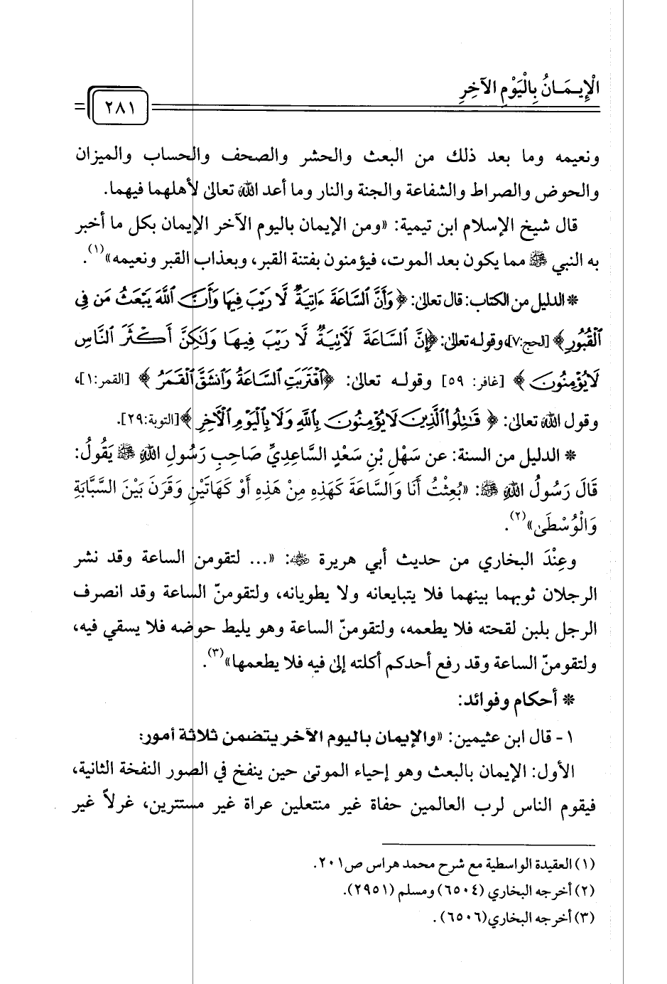 ١ - قال ابن عثيمين: "والإيمان باليوم الآخر يتضمن ثلاثة أمور: