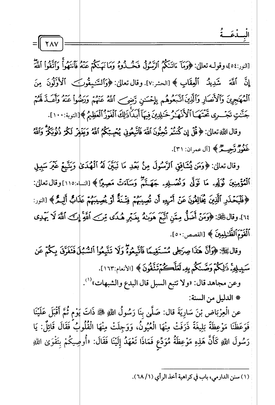 [النور: ٥٤]، وقوله تعالى: {وَمَا آتَاكُمُ الرَّسُولُ فَخُذُوهُ وَمَا نَهَاكُمْ عَنْهُ فَانْتَهُوا وَاتَّقُوا اللَّهَ إِنَّ اللَّهَ شَدِيدُ الْعِقَابِ} [الحشر: ٧]. وقال تعالى: {وَالسَّابِقُونَ الْأَوَّلُونَ مِنَ الْمُهَاجِرِينَ وَالْأَنْصَارِ وَالَّذِينَ اتَّبَعُوهُمْ بِإِحْسَانٍ رَضِيَ اللَّهُ عَنْهُمْ وَرَضُوا عَنْهُ وَأَعَدَّ لَهُمْ جَنَّاتٍ تَجْرِي تَحْتَهَا الْأَنْهَارُ خَالِدِينَ فِيهَا أَبَدًا ذَلِكَ الْفَوْزُ الْعَظِيمُ} [التوبة: ١٠٠].