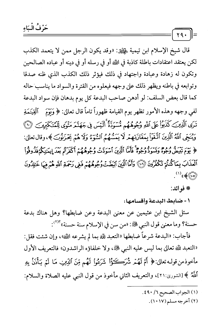 قال شيخ الإسلام ابن تيمية رَحِمَهُ الله: "وقد يكون الرجل ممن لا يتعمد الكذب لكن يعتقد اعتقادات باطلة كاذبة في الله أو في رسله أو في دينه أو عباده الصالحين وتكون له زهادة وعبادة واجتهاد في ذلك فيؤثر ذلك الكذب الذي ظنه صدقا وتوابعه في باطنه ويظهر ذلك على وجهه فيعلوه من القترة والسواد ما يناسب حاله كما قال بعض السلف: لو أدهن صاحب البدعة كل يوم بدهان فإن سواد البدعة لفي وجهه وهذه الأمور تظهر يوم القيامة ظهورًا تامًا قال تعالى: {وَيَوْمَ الْقِيَامَةِ تَرَى الَّذِينَ كَذَبُوا عَلَى اللَّهِ وُجُوهُهُمْ مُسْوَدَّةٌ أَلَيْسَ فِي جَهَنَّمَ مَثْوًى لِلْمُتَكَبِّرِينَ (٦٠) وَيُنَجِّي اللَّهُ الَّذِينَ اتَّقَوْا بِمَفَازَتِهِمْ لَا يَمَسُّهُمُ السُّوءُ وَلَا هُمْ يَحْزَنُونَ}، وقال تعالى: {يَوْمَ تَبْيَضُّ وُجُوهٌ وَتَسْوَدُّ وُجُوهٌ فَأَمَّا الَّذِينَ اسْوَدَّتْ وُجُوهُهُمْ أَكَفَرْتُمْ بَعْدَ إِيمَانِكُمْ فَذُوقُوا الْعَذَابَ بِمَا كُنْتُمْ تَكْفُرُونَ (١٠٦) وَأَمَّا الَّذِينَ ابْيَضَّتْ وُجُوهُهُمْ فَفِي رَحْمَةِ اللَّهِ هُمْ فِيهَا خَالِدُونَ (١٠٧)} " (¬١).