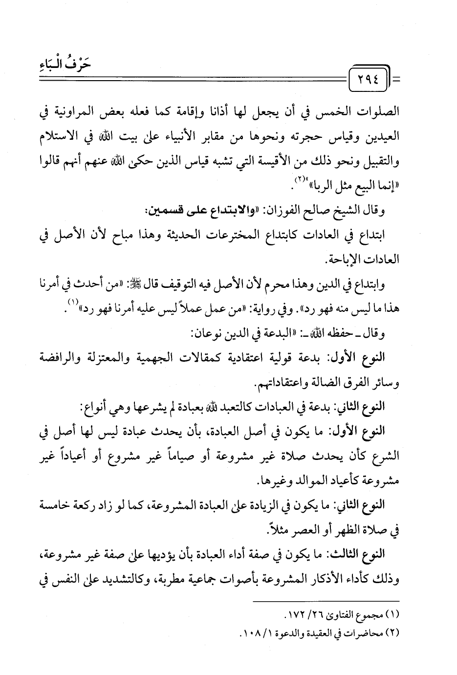 وقال الشيخ صالح الفوزان: "والابتداع على قسمين: