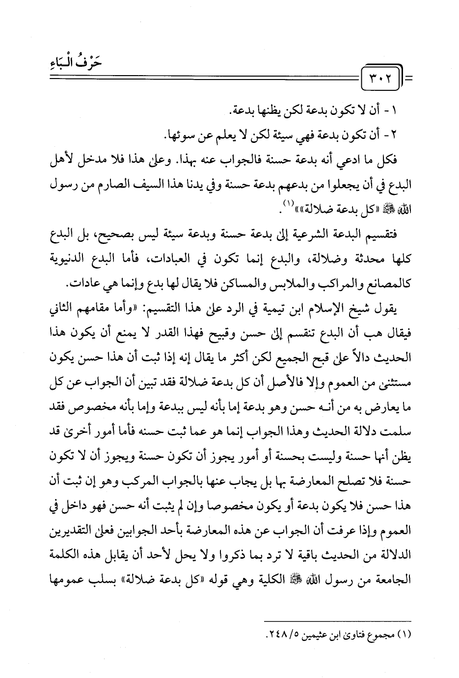 يقول شيخ الإسلام ابن تيمية في الرد على هذا التقسيم: "وأما مقامهم الثاني فيقال هب أن البدع تنقسم إلى حسن وقبيح فهذا القدر لا يمنع أن يكون هذا الحديث دالًا على قبح الجميع لكن أكثر ما يقال إنه إذا ثبت أن هذا حسن يكون مستثنى من العموم وإلا فالأصل أن كل بدعة ضلالة فقد تبين أن الجواب عن كل ما يعارض به من أنه حسن وهو بدعة إما بأنه ليس ببدعة وإما بأنه مخصوص فقد سلمت دلالة الحديث وهذا الجواب إنما هو عما ثبت حسنه فأما أمور أخرى قد يظن أنها حسنة وليست بحسنة أو أمور يجوز أن تكون حسنة ويجوز أن لا تكون حسنة فلا تصلح المعارضة بها بل يجاب عنها بالجواب المركب وهو إن ثبت أن هذا حسن فلا يكون بدعة أو يكون مخصوصا وإن لم يثبت أنه حسن فهو داخل في العموم وإذا عرفت أن الجواب عن هذه المعارضة بأحد الجوابين فعلى التقديرين الدلالة من الحديث باقية لا ترد بما ذكروا ولا يحل لأحد أن يقابل هذه الكلمة الجامعة من رسول الله -صلى الله عليه وسلم- الكلية وهي قوله "كل بدعة ضلالة" بسلب عمومها