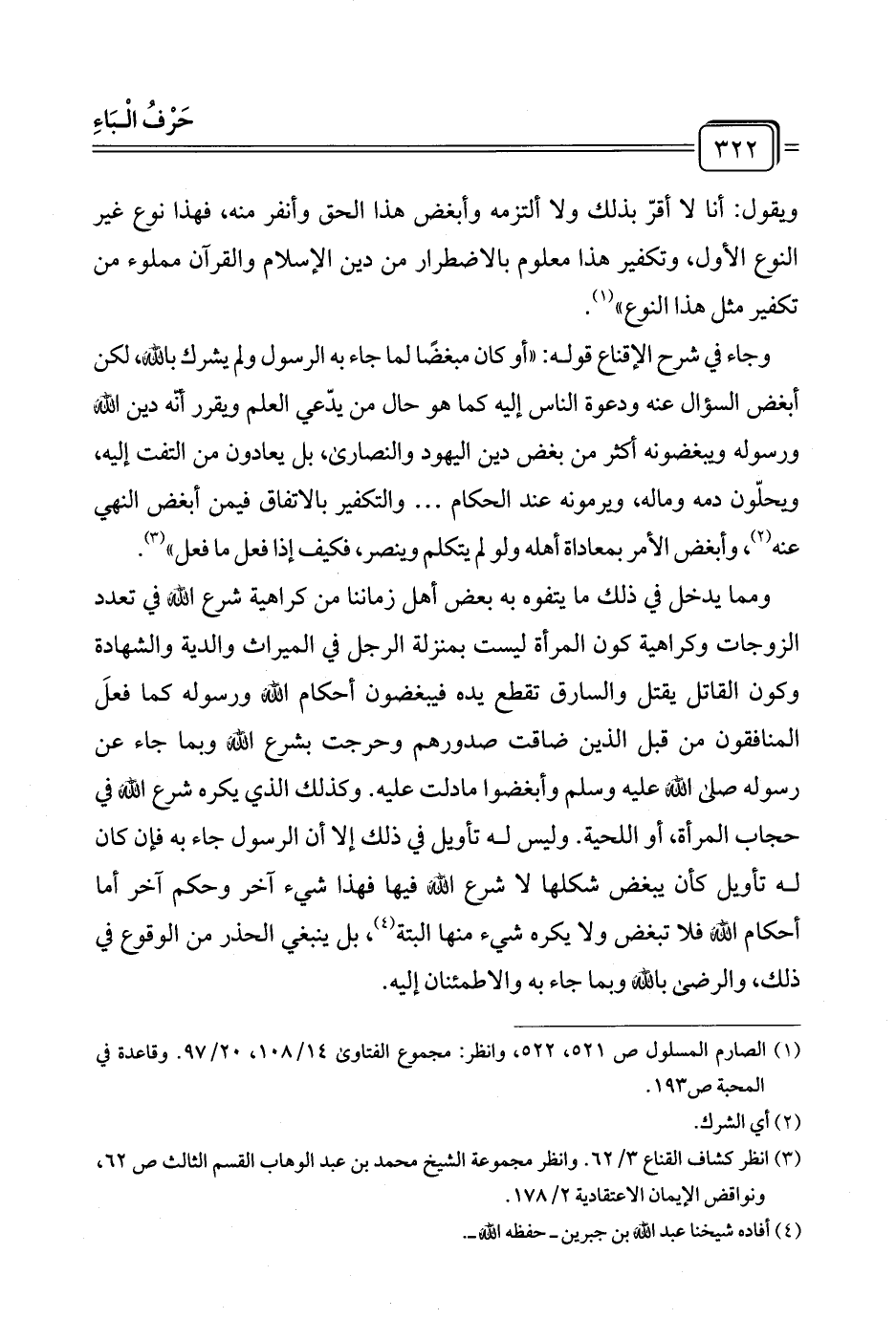 ومما يدخل في ذلك ما يتفوه به بعض أهل زماننا من كراهية شرع الله في تعدد الزوجات وكراهية كون المرأة ليست بمنزلة الرجل في الميراث والدية والشهادة وكون القاتل يقتل والسارق تقطع يده فيبغضون أحكام الله ورسوله كما فعلَ المنافقون من قبل الذين ضاقت صدورهم وحرجت بشرع الله وبما جاء عن رسوله صلى الله عليه وسلم وأبغضوا ما دلت عليه. وكذلك الذي يكره شرع الله في حجاب المرأة، أو اللحية. وليس له تأويل في ذلك إلا أن الرسول جاء به فإن كان له تأويل كأن يبغض شكلها لا شرع الله فيها فهذا شيء آخر وحكم آخر أما أحكام الله فلا تبغض ولا يكره شيء منها البتة (¬٤)، بل ينبغي الحذر من الوقوع في ذلك، والرضى بالله وبما جاء به والاطمئنان إليه.