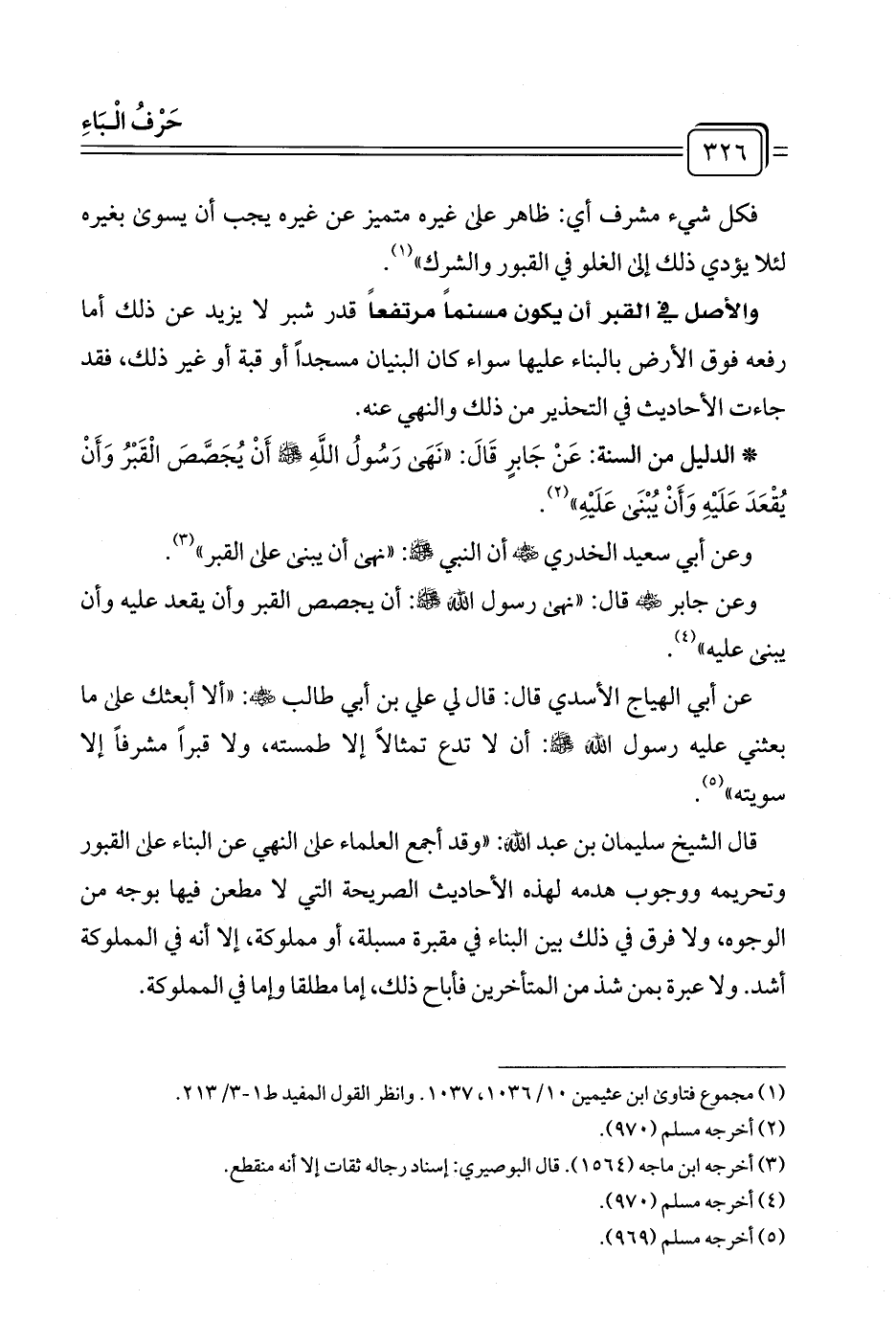 فكل شيء مشرف أي: ظاهر على غيره متميز عن غيره يجب أن يسوى بغيره لئلا يؤدي ذلك إلى الغلو في القبور والشرك" (¬١).