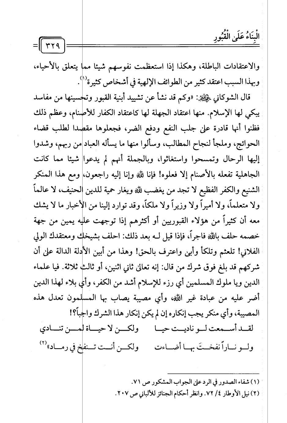 قال الشوكاني رحمهُ اللهُ: "وكم قد نشأ عن تشييد أبنية القبور وتحسينها من مفاسد يبكي لها الإسلام. منها اعتقاد الجهلة لها كاعتقاد الكفار للأصنام، وعظم ذلك فظنوا أنها قادرة على جلب النفع ودفع الضر، فجعلوها مقصدا لطلب قضاء الحوائج، وملجأ لنجاح المطالب، وسألوا منها ما يسأله العباد من ربهم، وشدوا إليها الرحال وتمسحوا واستغاثوا، وبالجملة أنهم لم يدعوا شيئا مما كانت الجاهلية تفعله بالأصنام إلا فعلوه! فإنا لله وإنا إليه راجعون، ومع هذا المنكر الشنيع والكفر الفظيع لا تجد من يغضب لله ويغار حمية للدين الحنيف، لا عالمًا ولا متعلمًا، ولا أميرًا ولا وزيرًا ولا ملكًا، وقد توارد إلينا من الأخبار ما لا يشك معه أن كثيرًا من هؤلاء القبوريين أو أكثرهم إذا توجهت عليه يمين من جهة خصمه حلف بالله فاجرًا، فإذا قيل له بعد ذلك: احلف بشيخك ومعتقدك الولي الفلاني! تلعثم وتلكأ وأبى واعترف بالحق! وهذا من أبين الأدله الدالة على أن شركهم قد بلغ فوق شرك من قال: إنه تعالى ثاني اثنين، أو ثالث ثلاثة. فيا علماء الدين ويا ملوك المسلمين أي رزء للإسلام أشد من الكفر، وأي بلاء لهذا الدين أضر عليه من عبادة غير الله، وأي مصيبة يصاب بها المسلمون تعدل هذه المصيبة، وأي منكر يجب إنكاره إن لم يكن إنكار هذا الشرك واجبًا؟!.