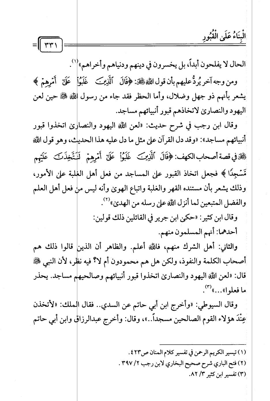 وقال ابن رجب في شرح حديث: "لعن الله اليهود والنصارى اتخذوا قبور أنبيائهم مساجد": "وقد دل القرآن على مثل ما دل عليه هذا الحديث، وهو قول الله عزَّ وجلَّ في قصة أصحاب الكهف: {قَالَ الَّذِينَ غَلَبُوا عَلَى أَمْرِهِمْ لَنَتَّخِذَنَّ عَلَيْهِمْ مَسْجِدًا} فجعل اتخاذ القبور على المساجد من فعل أهل الغلبة على الأمور، وذلك يشعر بأن مستنده القهر والغلبة واتباع الهوى وأنه ليس فعل أهل العلم والفضل المتبعين لما أنزل اللهَ على رسله من الهدى" (¬٢).