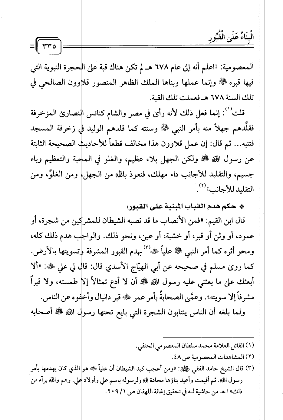 (¬٣) قال الشيخ حامد الفقي رحمهُ اللهُ: "ومن أعجب كيد الشيطان أن عليًا -رضي الله عنه- هو الذي كان يهدمها بأمر رسول الله. ثم أقيمت وأعيد بناؤها محادة لله ولرسوله باسم علي وأولاد علي. وهم والله برآء من ذلك" ا. هـ من حاشية له في تحقيق إغاثة اللهفان ص ١/ ٢٠٩.