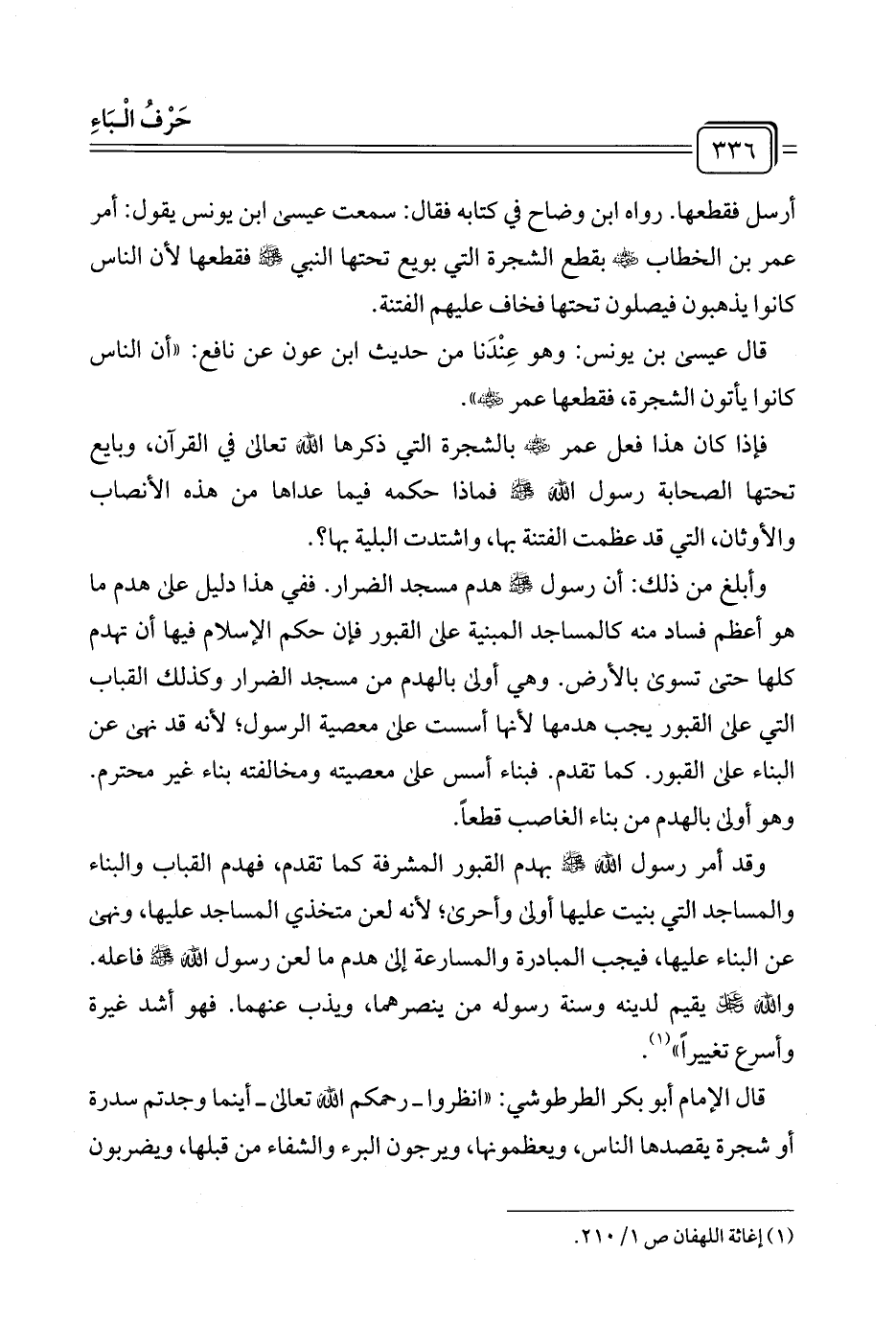 فإذا كان هذا فعل عمر -رضي الله عنه- بالشجرة التي ذكرها الله تعالى في القرآن، وبايع تحتها الصحابة رسول الله -صلى الله عليه وسلم- فماذا حكمه فيما عداها من هذه الأنصاب والأوثان، التي قد عظمت الفتنة بها، واشتدت البلية بها؟.