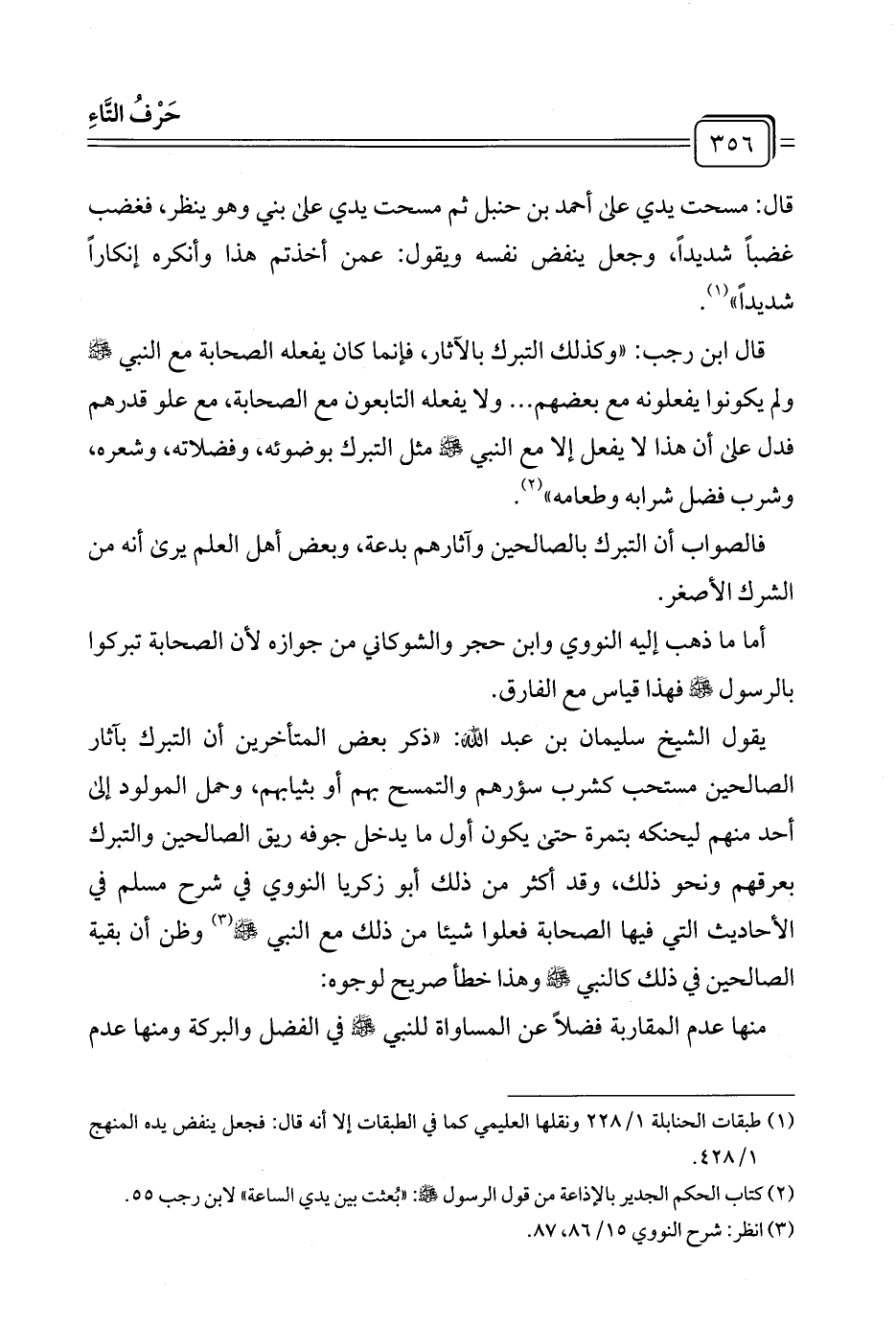 يقول الشيخ سليمان بن عبد الله: "ذكر بعض المتأخرين أن التبرك بآثار الصالحين مستحب كشرب سؤرهم والتمسح بهم أو بثيابهم، وحمل المولود إلى أحد منهم ليحنكه بتمرة حتى يكون أول ما يدخل جوفه ريق الصالحين والتبرك بعرقهم ونحو ذلك، وقد أكثر من ذلك أبو زكريا النووي في شرح مسلم في الأحاديث التي فيها الصحابة فعلوا شيئا من ذلك مع النبي -صلى الله عليه وسلم- (¬٣) وظن أن بقية الصالحين في ذلك كالنبي -صلى الله عليه وسلم- وهذا خطأ صريح لوجوه: