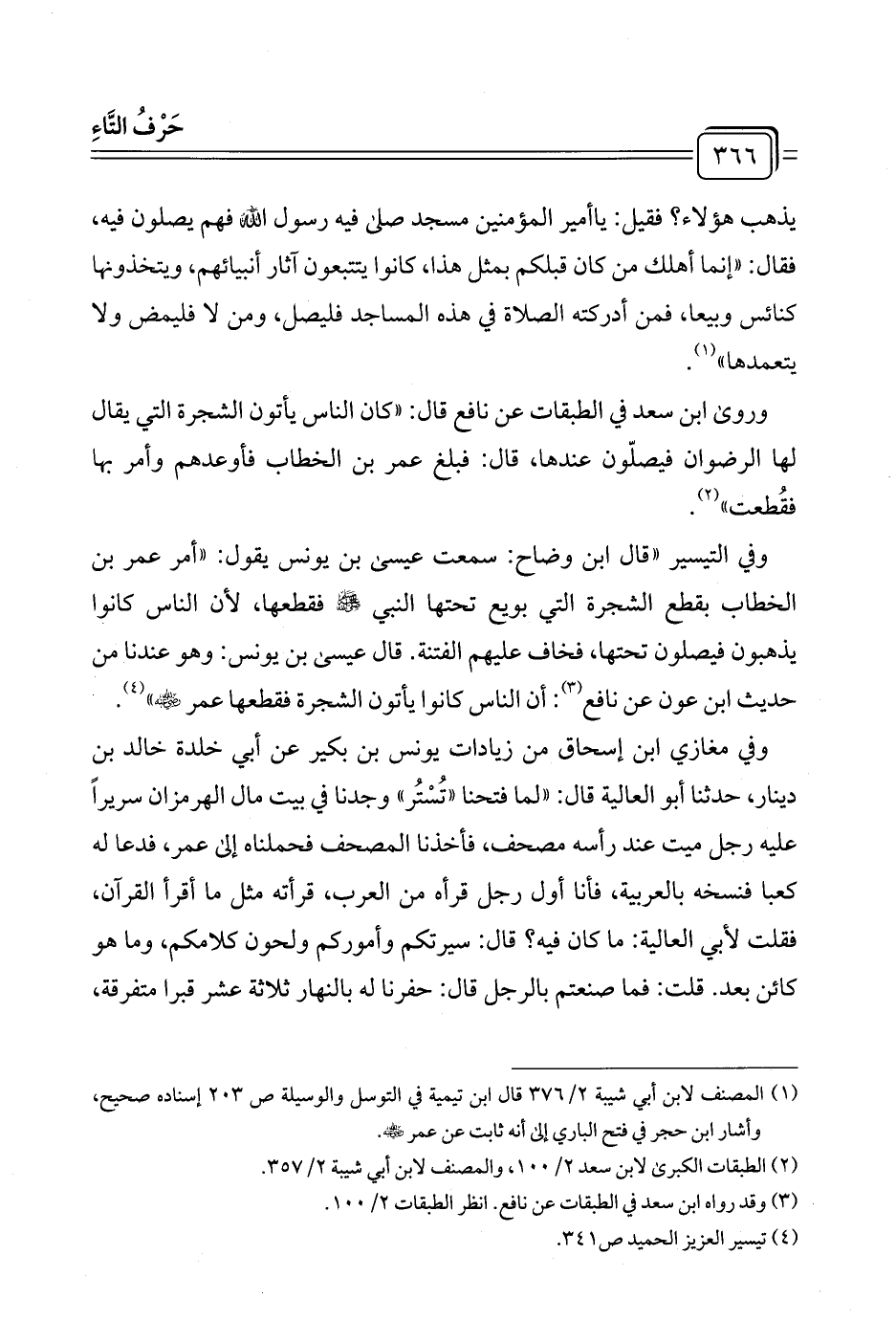 وفي التيسير "قال ابن وضاح: سمعت عيسى بن يونس يقول: "أمر عمر بن الخطاب بقطع الشجرة التي بويع تحتها النبي -صلى الله عليه وسلم - فقطعها، لأن الناس كانوا يذهبون فيصلون تحتها، فخاف عليهم الفتنة. قال عيسى بن يونس: وهو عندنا من حديث ابن عون عن نافع (¬٣): أن الناس كانوا يأتون الشجرة فقطعها عمر -رضي الله عنه-" (¬٤).