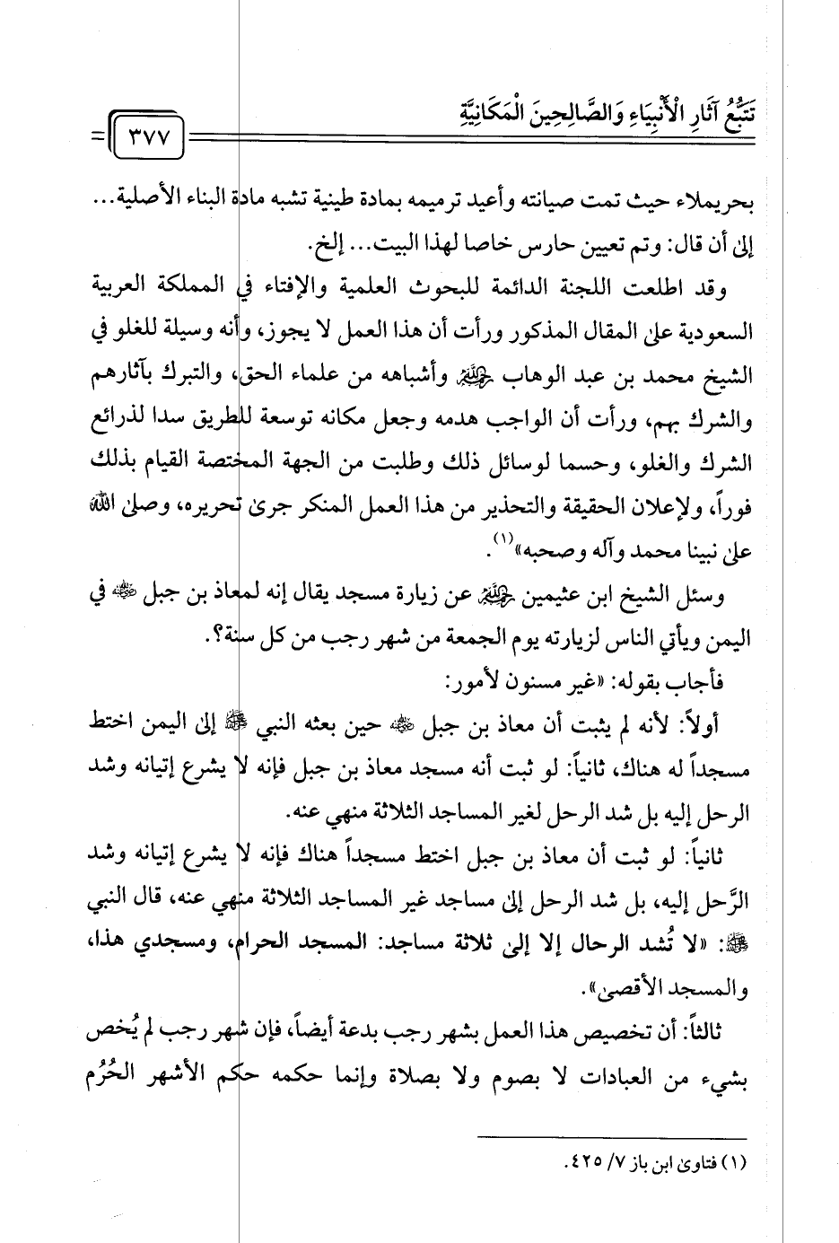 وقد اطلعت اللجنة الدائمة للبحوث العلمية والإفتاء في المملكة العربية السعودية على المقال المذكور ورأت أن هذا العمل لا يجوز، أنه وسيلة للغلو في الشيخ محمد بن عبد الوهاب -رحمه الله- وأشباهه من علماء الحق، والتبرك بآثارهم والشرك بهم، ورأت أن الواجب هدمه وجعل مكانه توسعة للطريق سدا لذرائع الشرك والغلو، وحسما لوسائل ذلك وطلبت من الجهة المختصة القيام بذلك فورًا، ولإعلان الحقيقة والتحذير من هذا العمل المنكر جرى تحريره، وصلى الله على نبينا محمد وآله وصحبه" (¬١).