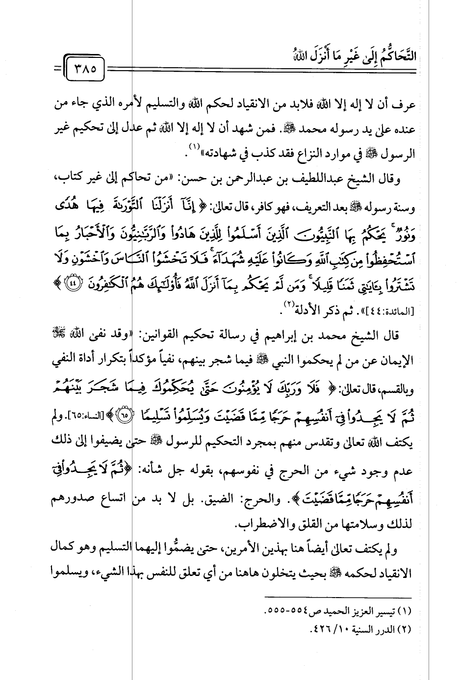 قال الشيخ محمد بن إبراهيم في رسالة تحكيم القوانين: "وقد نفى الله -سبحانه وتعالى- الإيمان عن من لم يحكموا النبي -صلى الله عليه وسلم- فيما شجر بينهم، نفيًا مؤكدًا بتكرار أداة النفي وبالقسم، قال تعالى: {فَلَا وَرَبِّكَ لَا يُؤْمِنُونَ حَتَّى يُحَكِّمُوكَ فِيمَا شَجَرَ بَيْنَهُمْ ثُمَّ لَا يَجِدُوا فِي أَنْفُسِهِمْ حَرَجًا مِمَّا قَضَيْتَ وَيُسَلِّمُوا تَسْلِيمًا (٦٥)} [النساء: ٦٥]. ولم يكتف اللهَ تعالى وتقدس منهم بمجرد التحكيم للرسول -صلى الله عليه وسلم- حتى يضيفوا إلى ذلك عدم وجود شيء من الحرج في نفوسهم، بقوله جل شأنه: {ثُمَّ لَا يَجِدُوا فِي أَنْفُسِهِمْ حَرَجًا مِمَّا قَضَيْتَ}. والحرج: الضيق. بل لا بد من اتساع صدورهم لذلك وسلامتها من القلق والاضطراب.