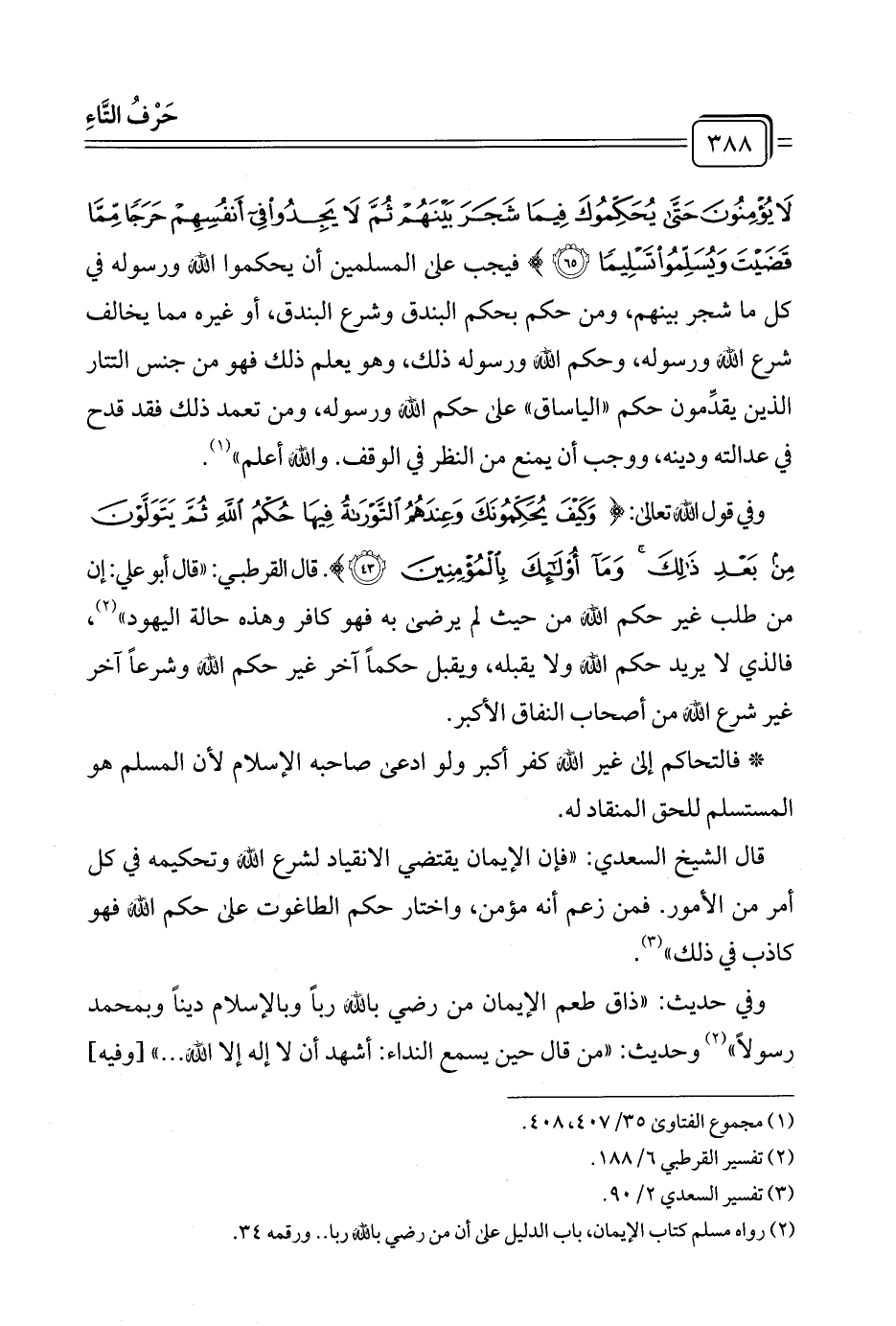 لَا يُؤْمِنُونَ حَتَّى يُحَكِّمُوكَ فِيمَا شَجَرَ بَيْنَهُمْ ثُمَّ لَا يَجِدُوا فِي أَنْفُسِهِمْ حَرَجًا مِمَّا قَضَيْتَ وَيُسَلِّمُوا تَسْلِيمًا (٦٥)} فيجب على المسلمين أن يحكموا الله ورسوله في كل ما شجر بينهم، ومن حكم بحكم البندق وشرع البندق، أو غيره مما يخالف شرع الله ورسوله، وحكم الله ورسوله ذلك، وهو يعلم ذلك فهو من جنس التتار الذين يقدِّمون حكم "الياساق" على حكم الله ورسوله، ومن تعمد ذلك فقد قدح في عدالته ودينه، ووجب أن يمنع من النظر في الوقف. والله أعلم" (¬١).