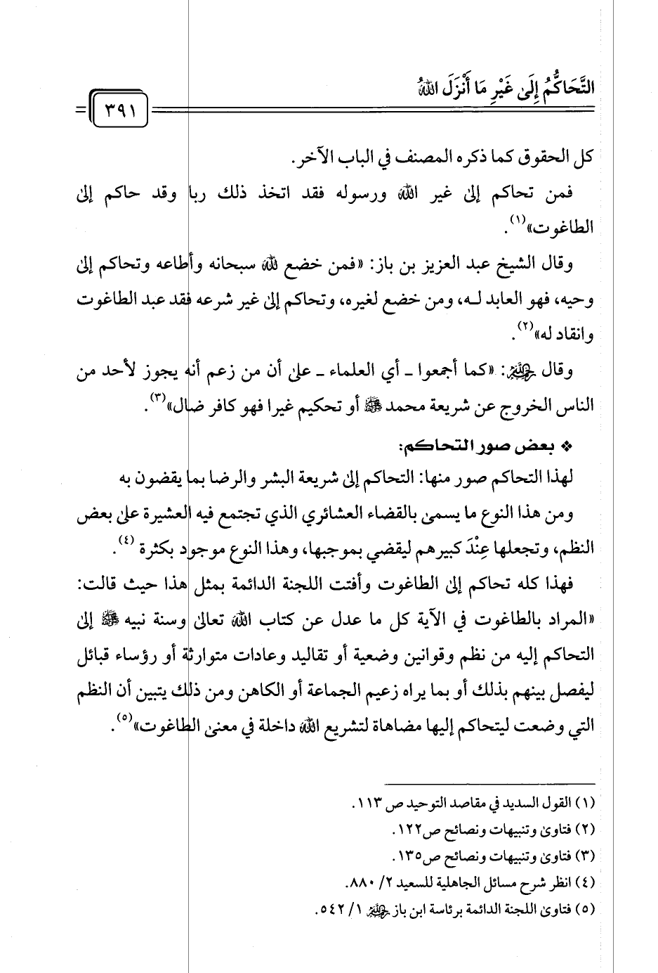 فهذا كله تحاكم إلى الطاغوت وأفتت اللجنة الدائمة بمثل هذا حيث قالت: "المراد بالطاغوت في الآية كل ما عدل عن كتاب الله تعالى وسنة نبيه -صلى الله عليه وسلم- إلى التحاكم إليه من نظم وقوانين وضعية أو تقاليد وعادات متوارثة أو رؤساء قبائل ليفصل بينهم بذلك أو بما يراه زعيم الجماعة أو الكاهن ومن ذي يتبين أن النظم التي وضعت ليتحاكم إليها مضاهاة لتشريع الله داخلة في معنى الطاغوت" (¬٥).