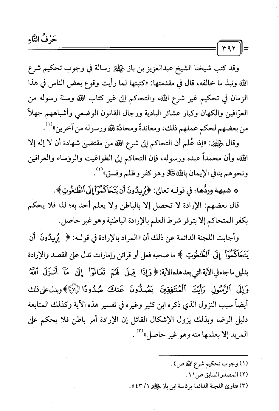 وقد كتب شيخنا الشيخ عبد العزيز بن باز -رحمه الله- رسالة في وجوب تحكيم شرع الله ونبذ ما خالفه، قال في مقدمتها: "كتبتها لما رأيت وقوع بعض الناس في هذا الزمان في تحكيم غير شرع الله، والتحاكم إلى غير كتاب الله وسنة رسوله من العرّافين والكهان وكبار عشائر البادية ورجال القانون الوضعي وأشباههم جهلًا من بعضهم لحكم عملهم ذلك، ومعاندةً ومحادّة لله ورسوله من آخرين" (¬١).