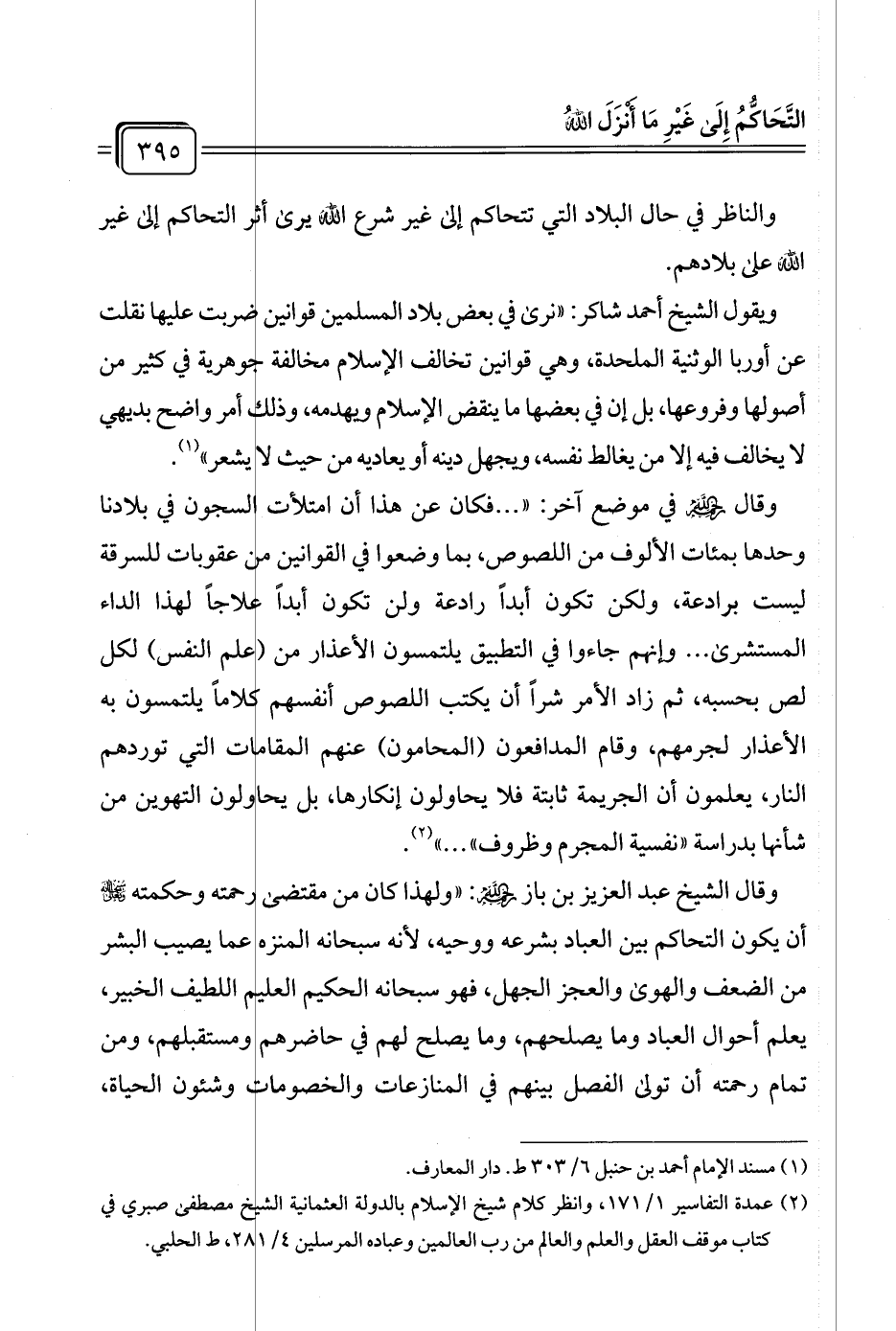 ويقول الشيخ أحمد شاكر: "نرى في بعض بلاد المسلمين قوانين ضربت عليها نقلت عن أوربا الوثنية الملحدة، وهي قوانين تخالف الإسلام مخالفة جوهرية في كثير من أصولها وفروعها، بل إن في بعضها ما ينقض الإسلام ويهدمه، وذلك أمر واضح بديهي لا يخالف فيه إلا من يغالط نفسه، ويجهل دينه أو يعاديه من حيث لا يشعر" (¬١).