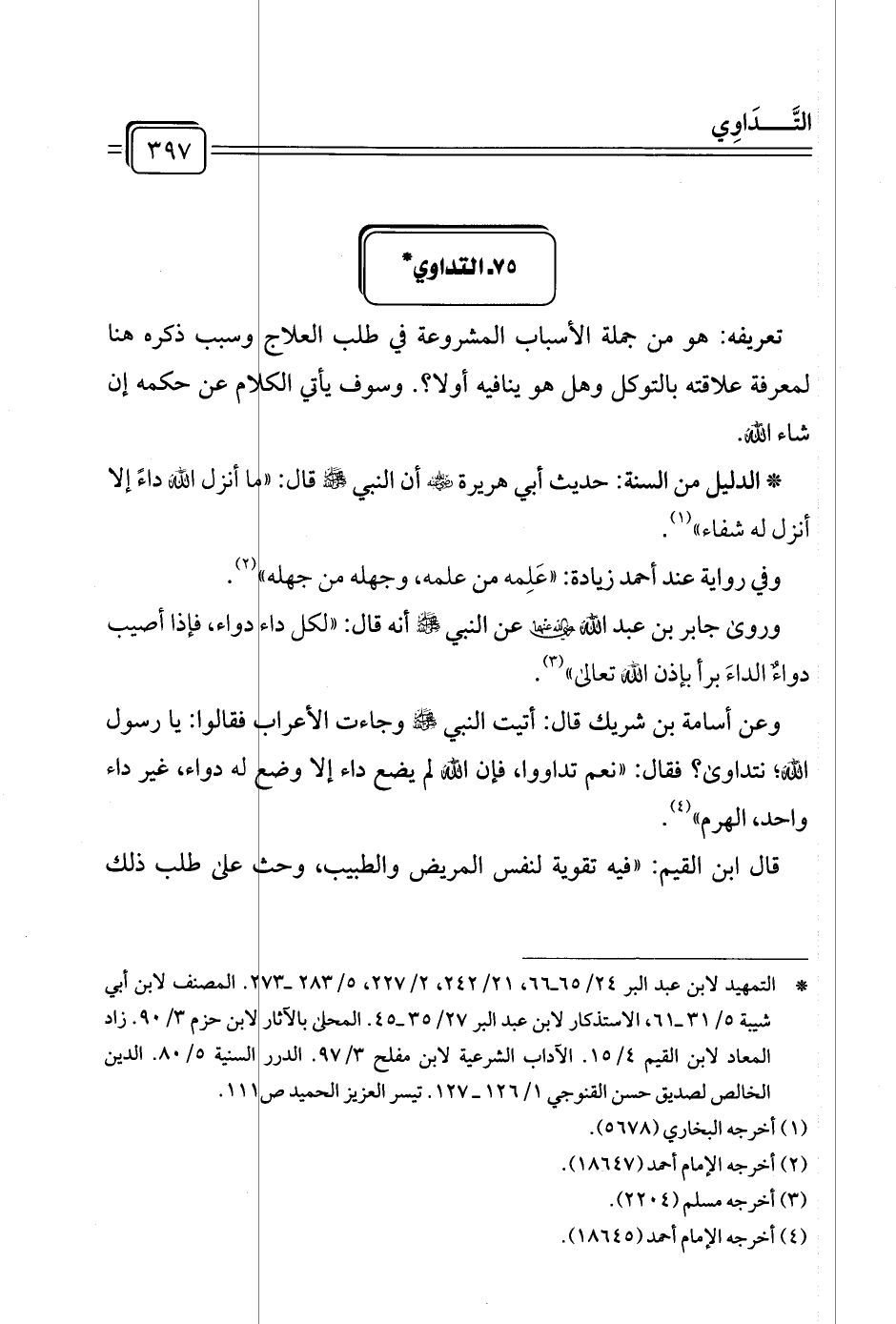 وعن أسامة بن شريك قال: أتيت النبي -صلى الله عليه وسلم- وجاءت الأعراب فقالوا: يا رسول الله؛ نتداوى؟ فقال: "نعم تداووا، فإن الله لم يضع داء إلا وضع له دواء، غير داء واحد، الهرم" (¬٤).